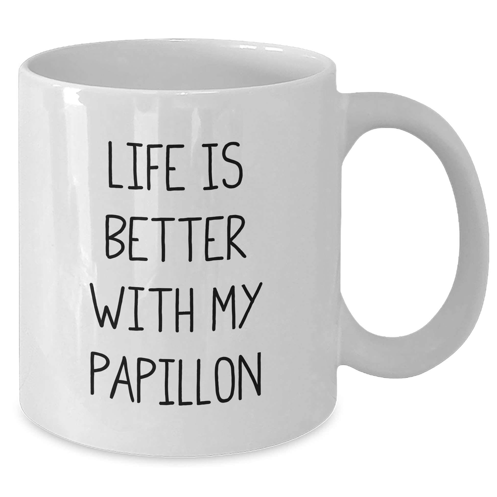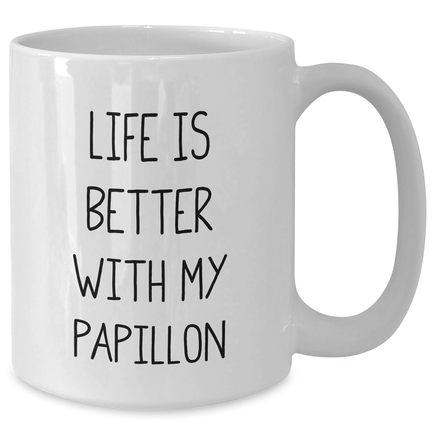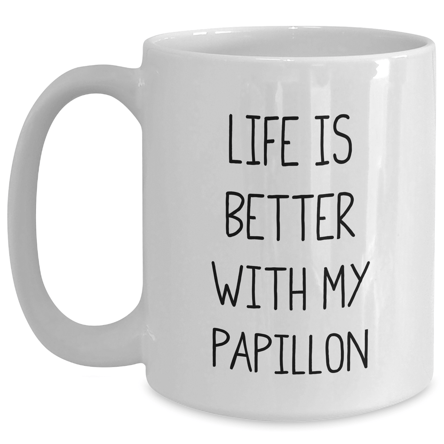 - Make a thoughtful and unique gift for the Papillon Dog lover in your life with this 'Life Is Better With My Papillon' white coffee mug, perfect for Father's Day or any occasion. The ceramic mug is available in 11oz or 15oz capacity to suit their coffee or tea preferences.