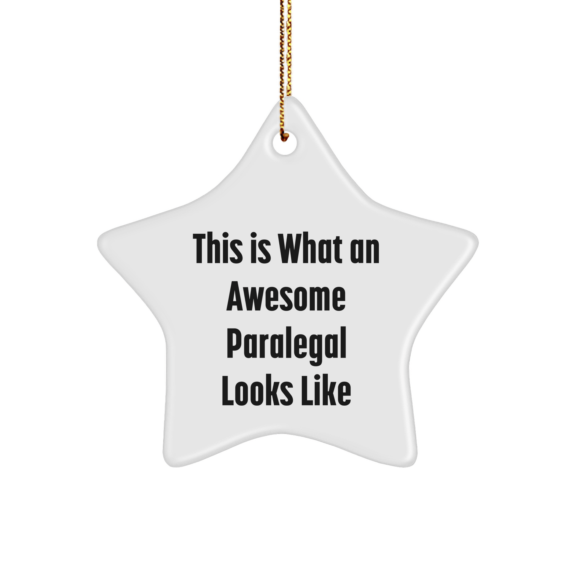 - This star-shaped ornament is a unique and thoughtful gift for paralegal professionals and students alike, featuring the inspirational quote 'This Is What An Awesome Paralegal Looks Like'.
