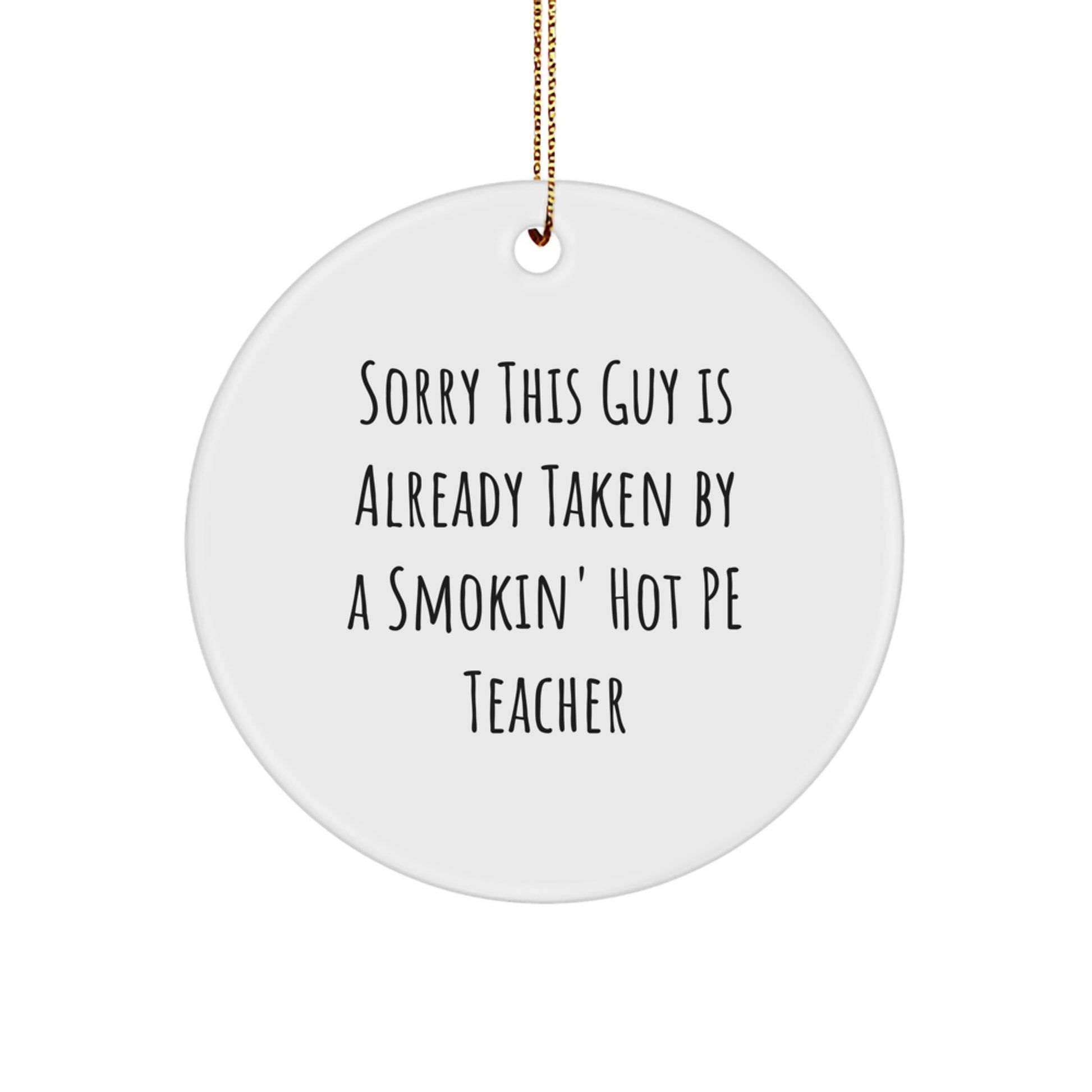 Are you looking for a unique gift for a PE Teacher? Look no further! Our Circle Ornament is the perfect way to show your appreciation for their hard work. The quote 'Sorry This Guy Is Already Taken By A Smokin' Hot PE Teacher' is a funny and relatable way to express your admiration. Made from sturdy MDF with a high-gloss plastic finish, this ornament is lightweight and resistant to breaking. It's perfect for households with children or pets. The festive gold cord makes it easy to hang, and the vibrant colors will stand out on your Christmas tree. Whether you're a parent, friend, or coworker, this gift is sure to bring a smile to the PE Teacher's face. So why wait? Get your PE Teacher Circle Ornament today and make their Christmas season a little brighter.