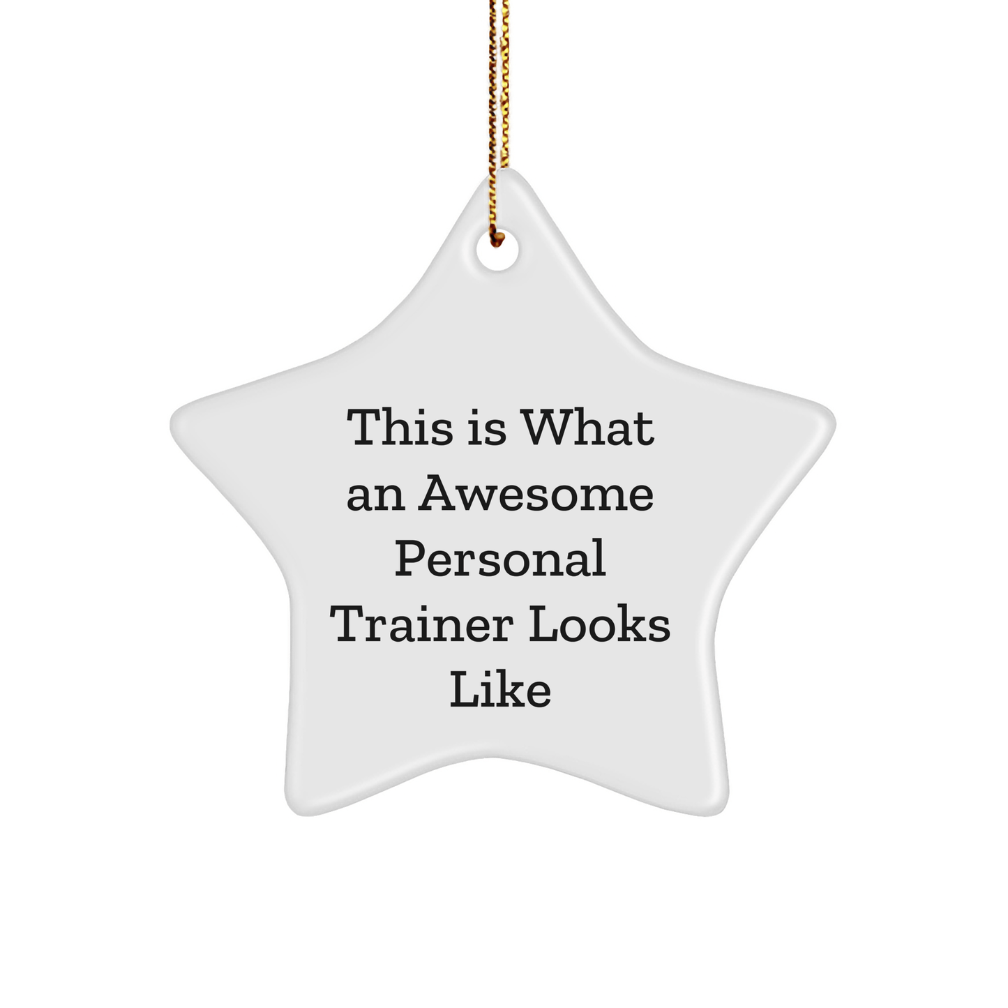 - This Star Ornament is a unique gift idea for Personal Trainers who appreciate humor and motivational quotes. The quote 'This Is What An Awesome Personal Trainer Looks Like' is funny and inspiring, making it a great conversation starter.