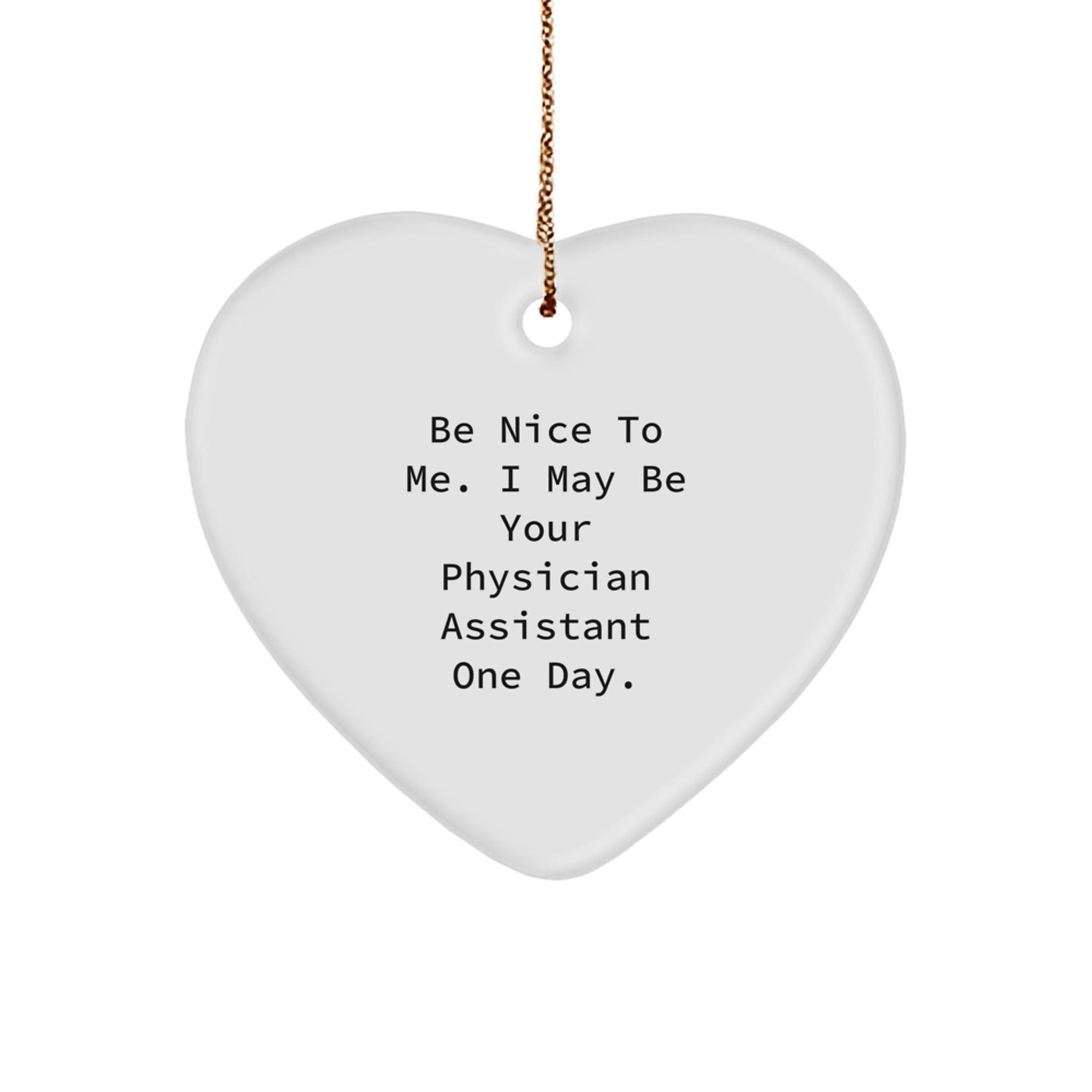 - Funny quote 'Be Nice To Me. I May Be Your Physician Assistant One Day.' adds a touch of humor to this heart-shaped ornament