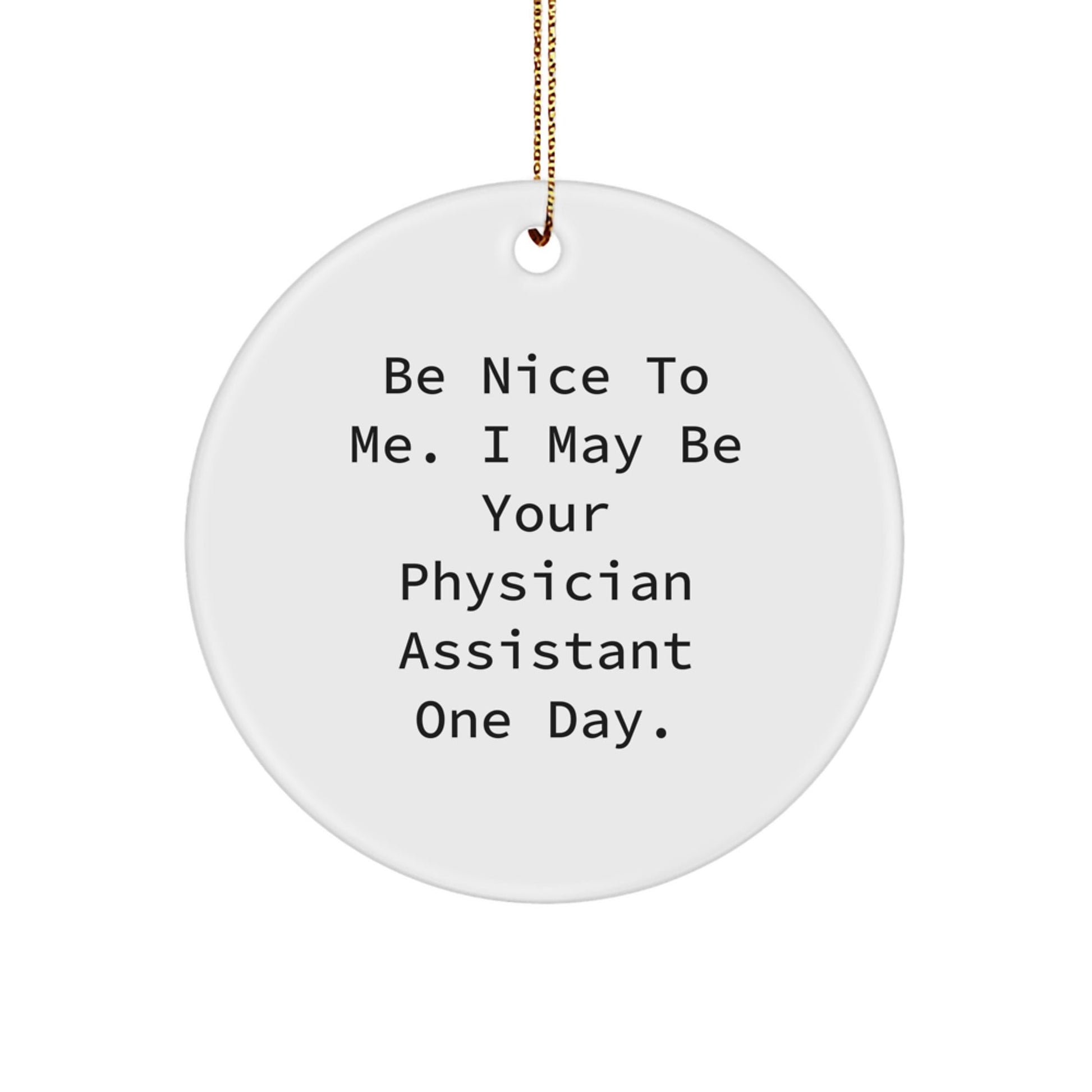 - This Circle Ornament is a unique and thoughtful gift for Physician Assistants, perfect for showing your appreciation for their hard work and dedication. The 'Be Nice To Me. I May Be Your Physician Assistant One Day.' quote adds a touch of humor and inspiration to the design.