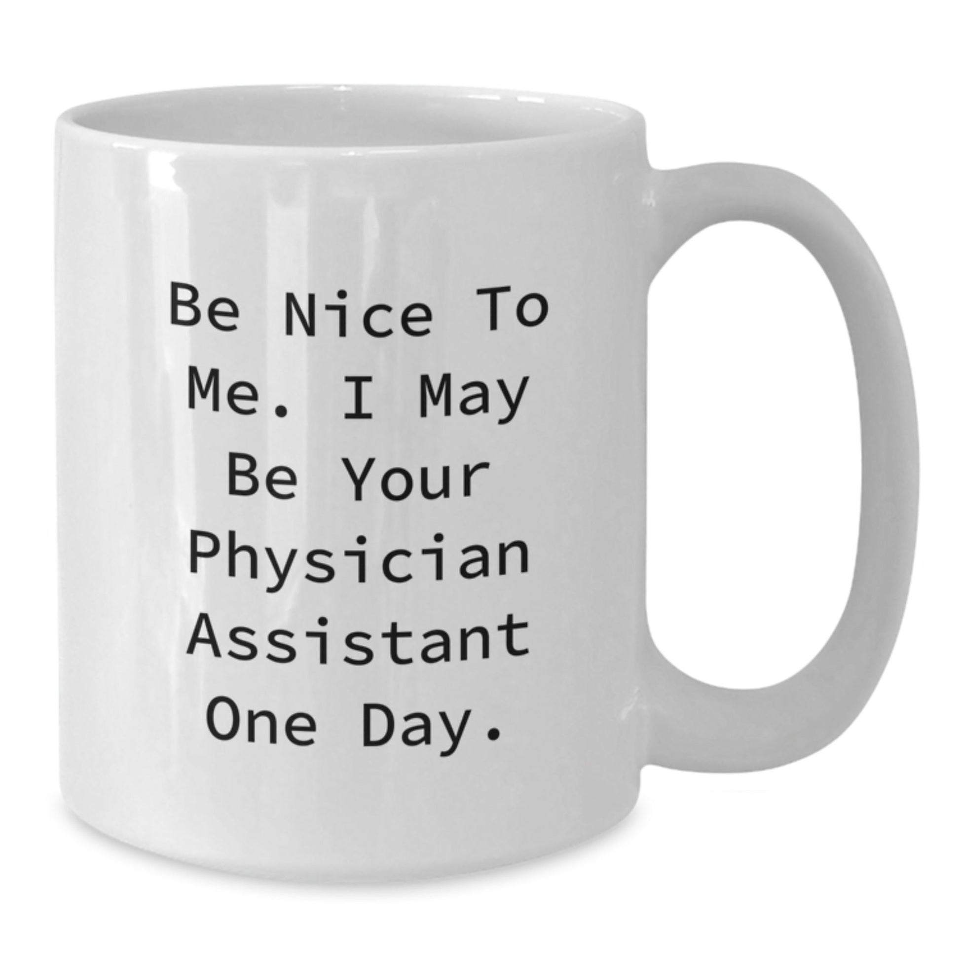 Are you a fan of Physician Assistants? Do you have a Physician Assistant friend or family member graduating soon? Look no further for a unique and humorous gift! This White Coffee Mug, with the quote 'Be Nice to Me. I May Be Your Physician Assistant One Day.', is the perfect way to show your appreciation for their dedication and hard work. Made from ceramic, this mug is safe for both microwave and dishwasher use, and comes in a convenient 11oz or 15oz capacity. It's the ideal gift for any Physician Assistant, no matter their sense of humor.