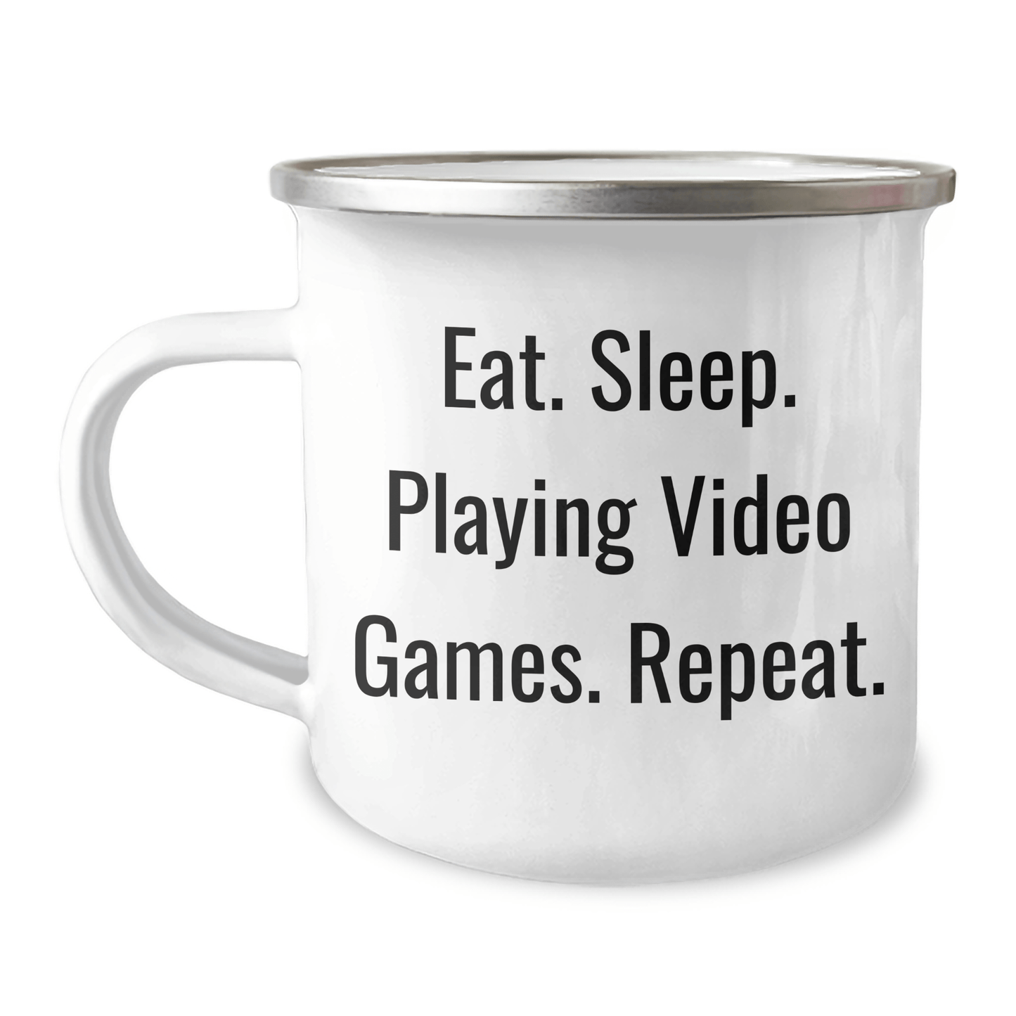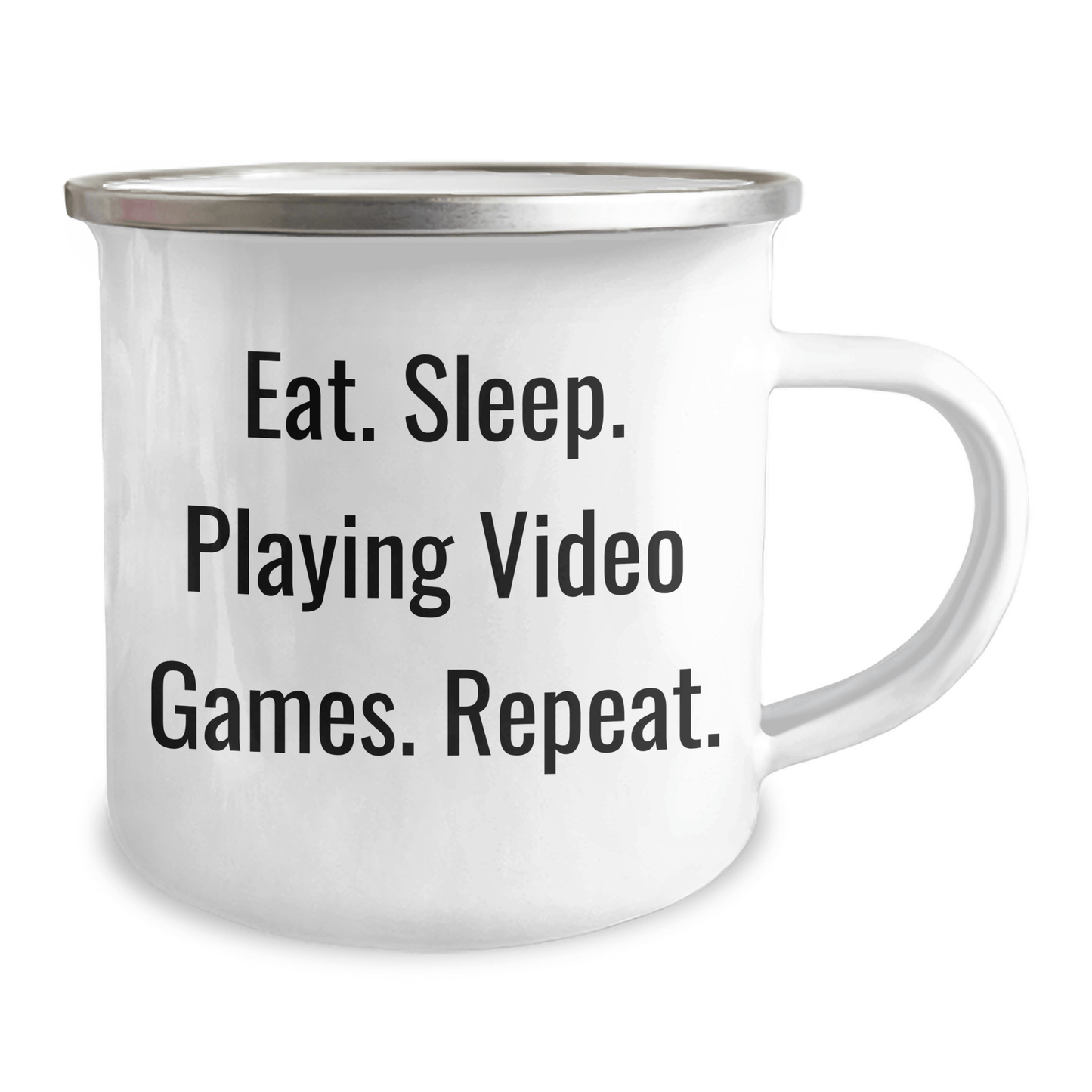 Are you tired of playing video games all day and night? Do you have a friend or family member who is obsessed with playing video games? If so, this funny camping mug is the ideal gift for them! The quote 'Eat. Sleep. Playing Video Games. Repeat.' is sure to bring a smile to their face.