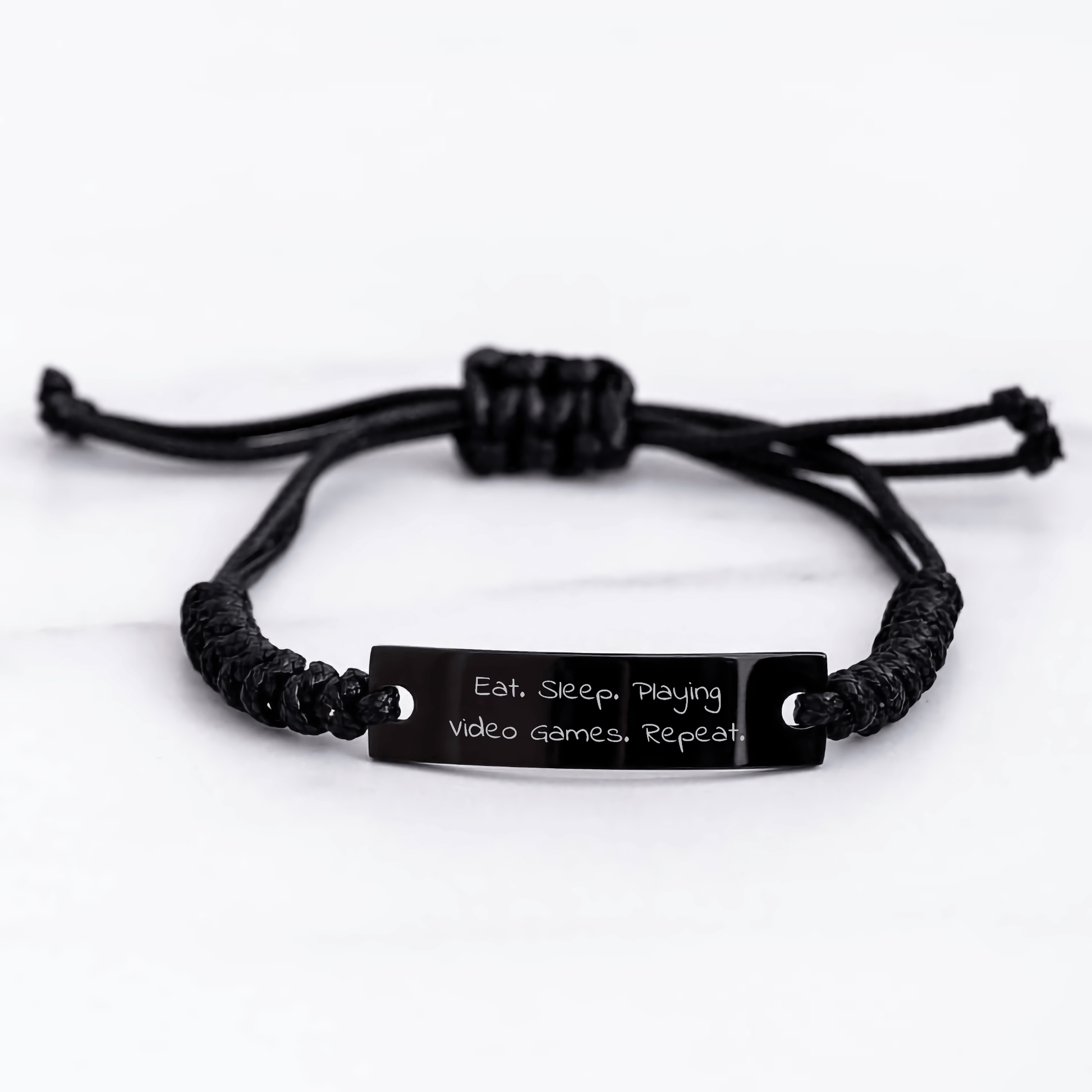 If you know someone who loves playing video games, this funny rope bracelet is the ideal gift for them. Made of black stainless steel with interlaced rope, it's resistant to rust, corrosion, and tarnishing, making it a great accessory for any occasion. Whether it's Father's Day, a birthday, or just because, this unique gift is sure to bring a smile to their face. The quote 'Eat. Sleep. Playing Video Games. Repeat.' is engraved on the bracelet, making it a thoughtful and humorous gift for any gamer. Give the gift of gaming with this adjustable rope bracelet that fits any wrist size. Get ready to level up your gift game with this awesome gift for friends, family, or coworkers who love playing video games. Don't miss out on this opportunity to show your appreciation for the gamers in your life. Don't miss out and make their day!