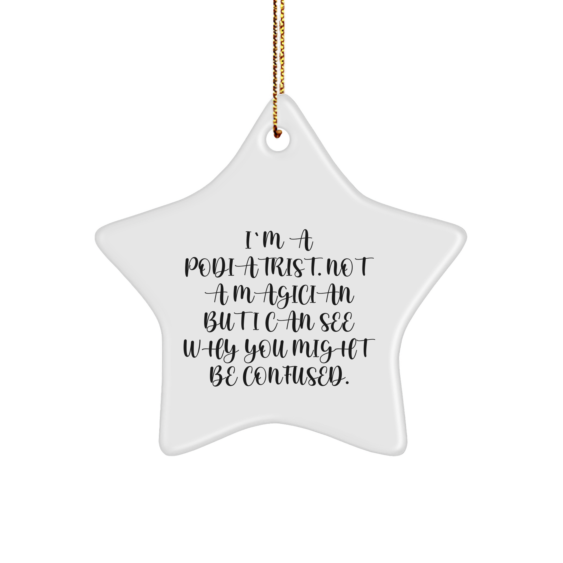 Are you looking for a unique and humorous gift for the podiatrist in your life? Look no further! This 'I'm A Podiatrist. Not A Magician...' Star Ornament is the perfect way to show your appreciation for their hard work and dedication to their craft. With its vibrant colors and fun design, this ornament is sure to bring a smile to their face. Whether you're a patient, a colleague, or just a friend, this gift is sure to be a hit. So why not give the gift of laughter and joy this Christmas? Order this Star Ornament today and make it a holiday to remember!