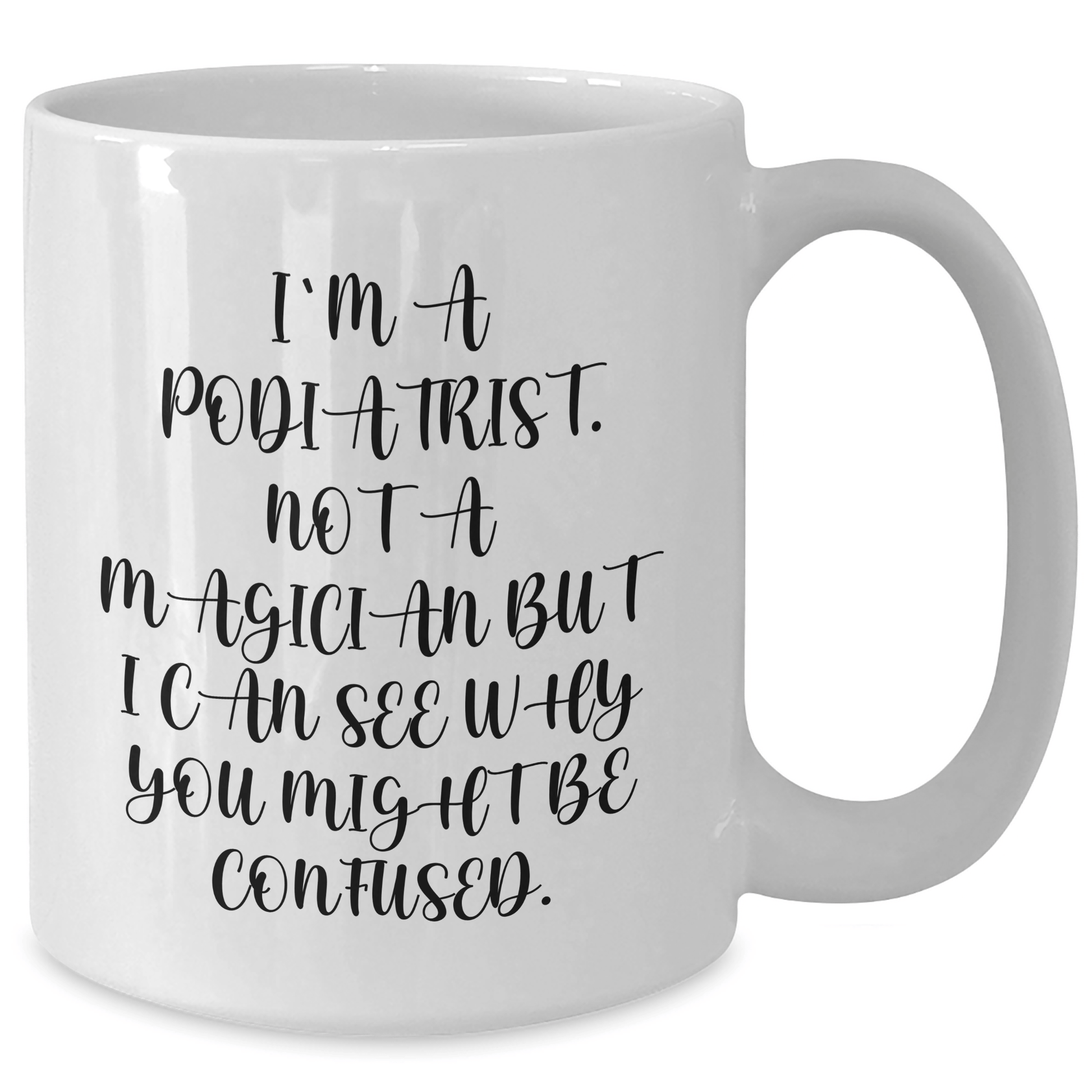 - Say goodbye to confusing medical jargon with this 'I'm A Podiatrist. Not A Magician But I Can See Why You Might Be Confused.' White Coffee Mug, perfect for Father's Day gift for the podiatrist in your life. With its unique design, this mug is sure to spark conversations and bring a smile to their face.