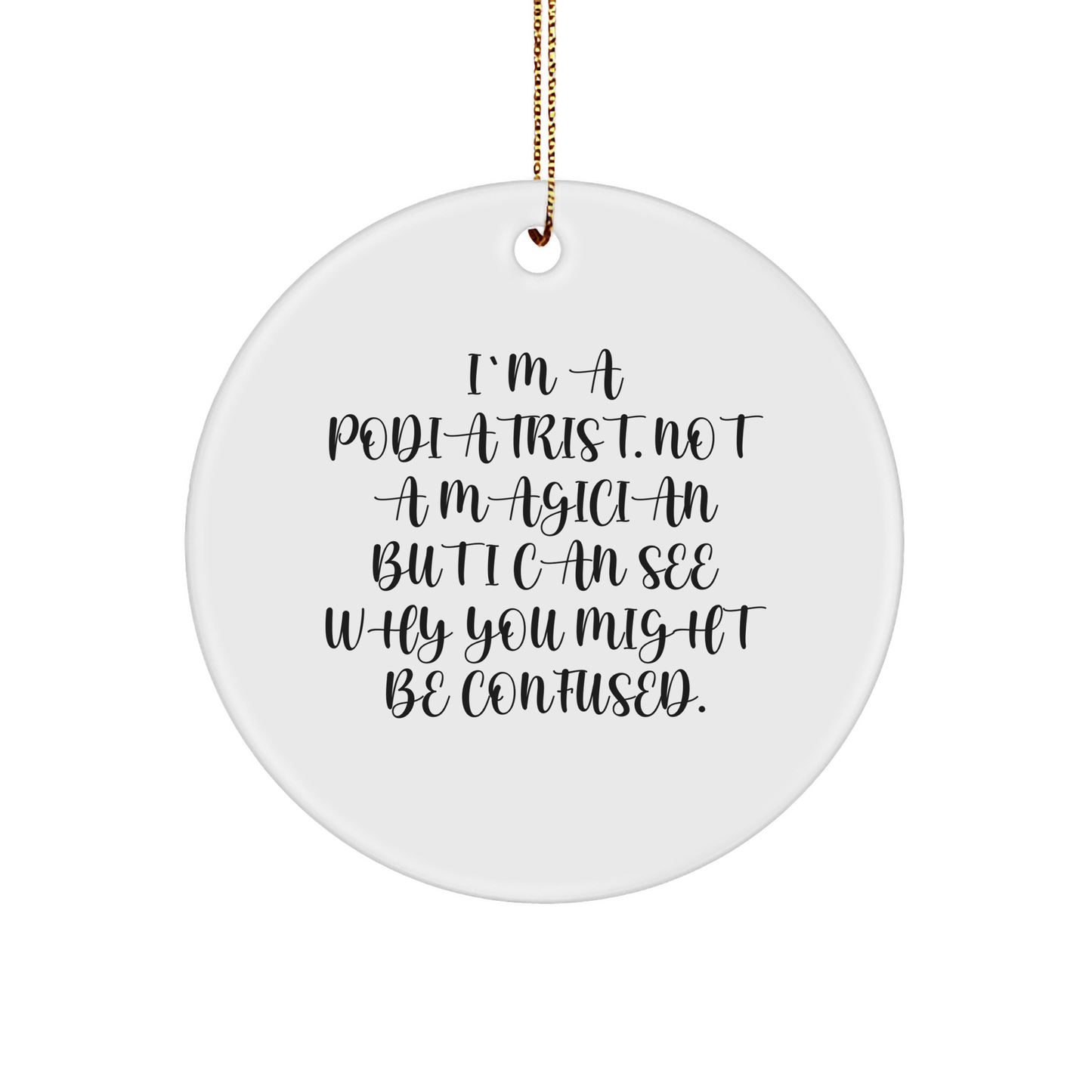 Are you a Podiatrist enthusiast or someone looking for a unique gift for a Podiatrist friend or family member? Look no further! This Circle Ornament is a thoughtful and humorous gift that will bring a smile to their face. With its vibrant colors and fun design, it's perfect for any Podiatrist who loves their work. The quote 'I'm A Podiatrist, Not A Magician' is a relatable and entertaining phrase that will surely resonate with Podiatrists everywhere. This Circle Ornament is a great way to show your appreciation for all that they do. It's also a unique and thoughtful gift for coworkers, friends, or family members who appreciate the work of Podiatrists. So why not give the gift of laughter and appreciation this Christmas?