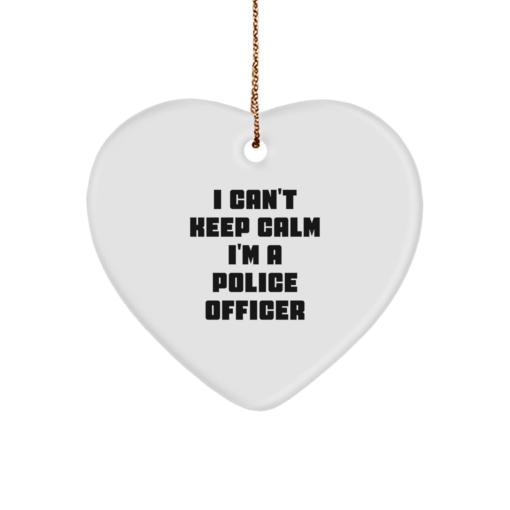 - This funny 'I Can't Keep Calm I'm A Police Officer' Heart Ornament is a unique and thoughtful gift for any Police Officer enthusiast or someone who loves to show their support for law enforcement officers. Made from sturdy MDF with a high-gloss plastic finish, this ornament is vibrantly printed from edge-to-edge via Sublimation, ensuring bright, vivid colors that will last for years to come. Lightweight and resistant to breaking, it's a great choice for households with children or pets.