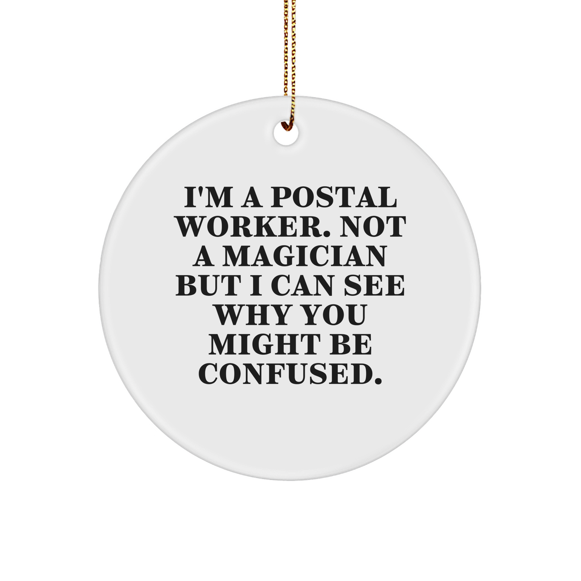 This circle ornament is crafted from sturdy MDF with a high-gloss plastic finish, ensuring long-lasting designs and vibrant colors. The quote 'I'm A Postal Worker. Not A Magician But I Can See Why You Might Be Confused.' adds a touch of humor to this thoughtful gift. Perfect for Christmas or any other occasion, this ornament is a great way to show your appreciation for the postal workers in your life. So why wait? Don't miss out and make someone's day!