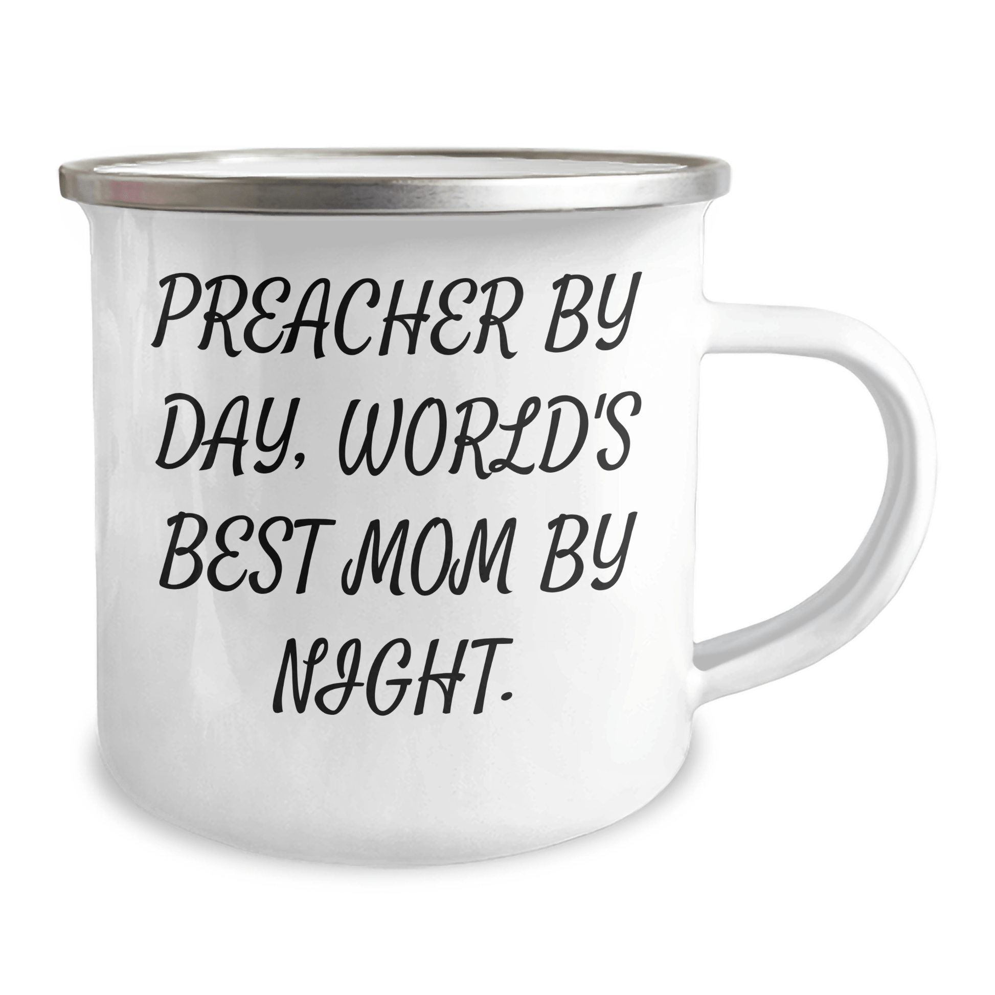 - 'Preacher By Day, World's Best Mom By Night.' A unique and humorous quote that makes this camping mug stand out. Perfect for the preacher in your life who loves the outdoors and values family time. The stainless steel with enamel finish ensures durability and easy cleaning.