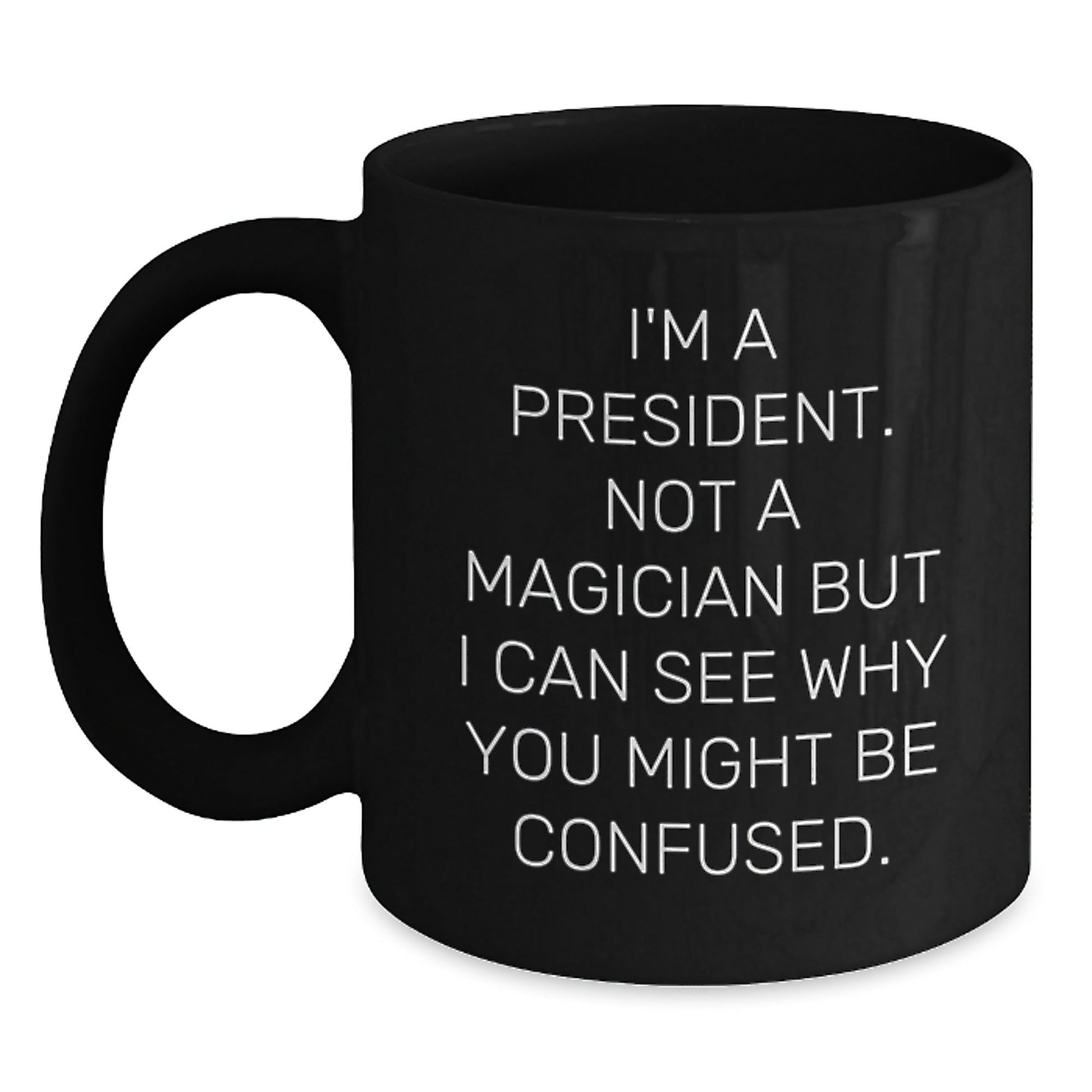 - Make a statement with our 'I'm A President. Not A Magician But I Can See Why You Might Be Confused.' Black Coffee Mug, perfect for any President or political enthusiast on their birthday, featuring a unique quote that's sure to spark conversations and show off your sense of humor, all while enjoying your favorite hot beverage in a ceramic mug that's both stylish and functional.