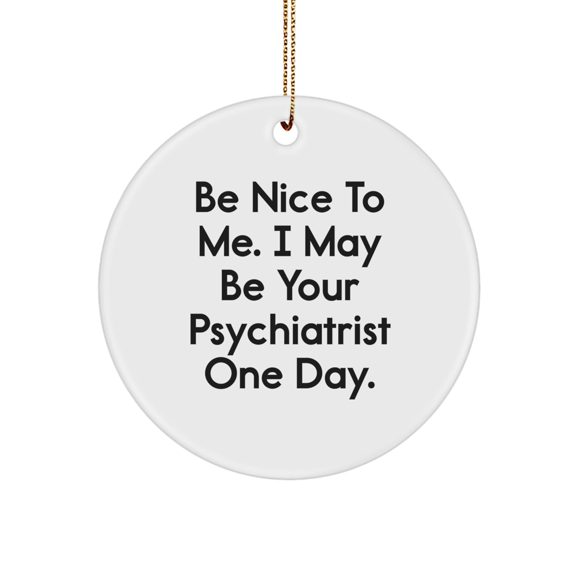 Are you looking for a unique gift for the Psychiatrist in your life? Look no further! This Circle Ornament is a thoughtful and funny present that they'll cherish. The quote 'Be Nice To Me. I May Be Your Psychiatrist One Day.' adds a touch of humor and personality to the design. The white circle shape is crafted from sturdy MDF with a high-gloss plastic finish, ensuring a long-lasting and vibrant design. The lightweight and resistant to breaking makes it a great choice for households with children or pets. It's the ideal gift for Psychiatrist enthusiasts or for anyone who appreciates a good sense of humor. Whether you're shopping for a birthday, Christmas, or just because, this Circle Ornament is a thoughtful and unique gift idea. So why not show your appreciation for the Psychiatrist in your life with this fun and quirky gift?