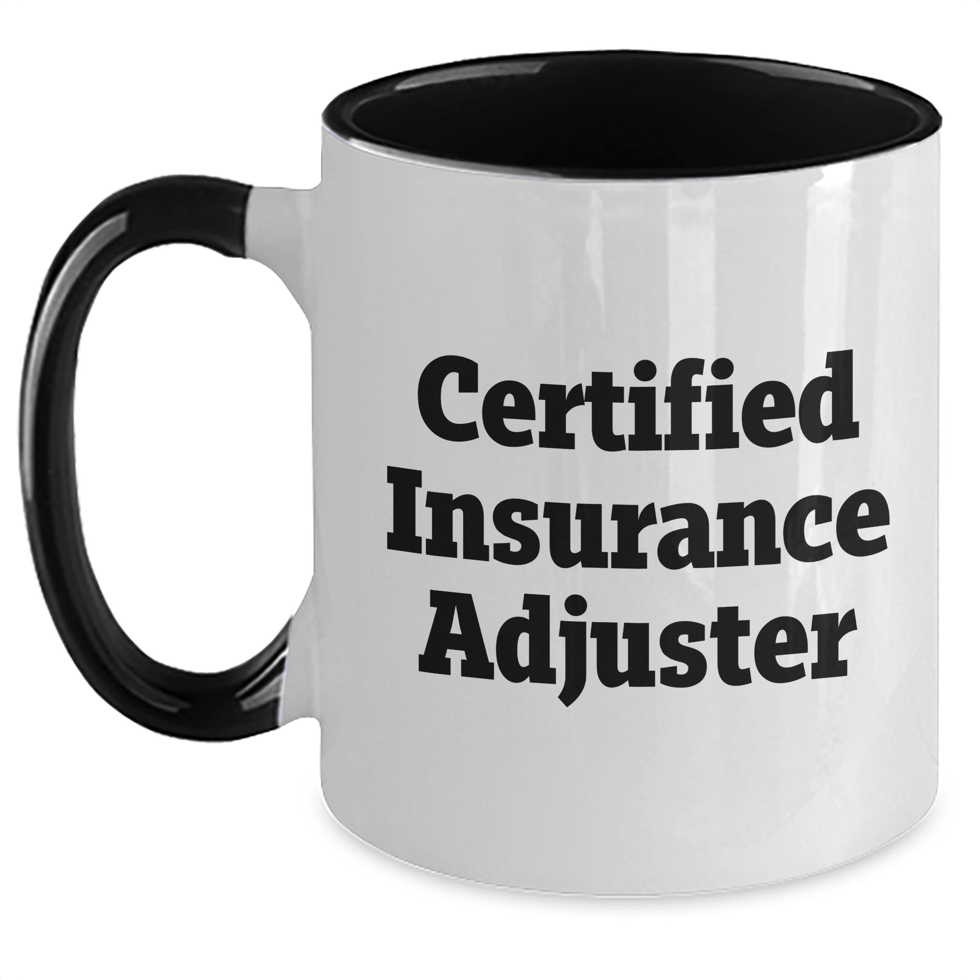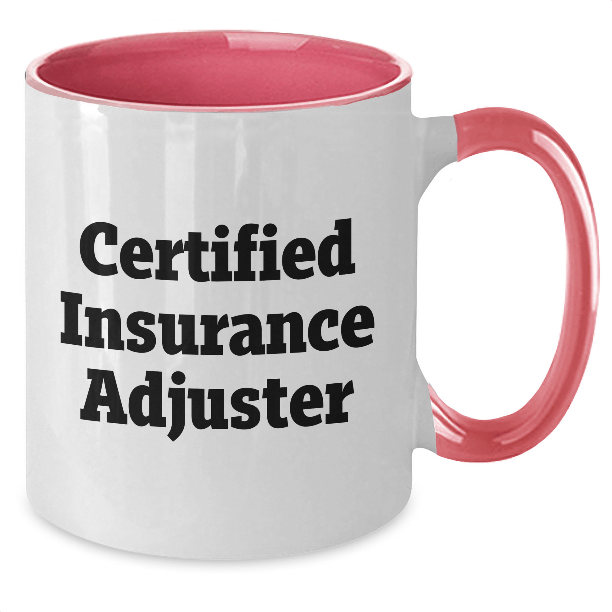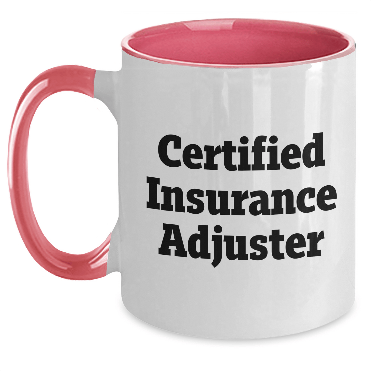 - Make a statement with your unique style as a 'Certified Insurance Adjuster' with this Two Tone Coffee Mug, available in four color combinations - Black and White, Red and White, Navy and White, and Pink and White - to match your personality and preferences, with an 11oz capacity perfect for your daily coffee or tea.