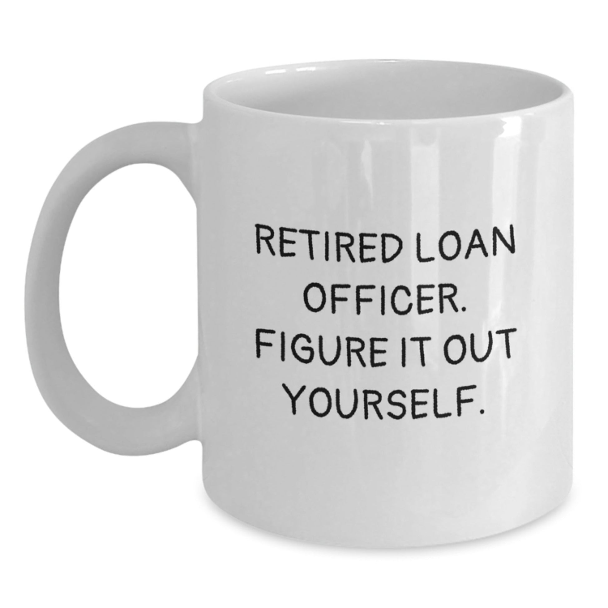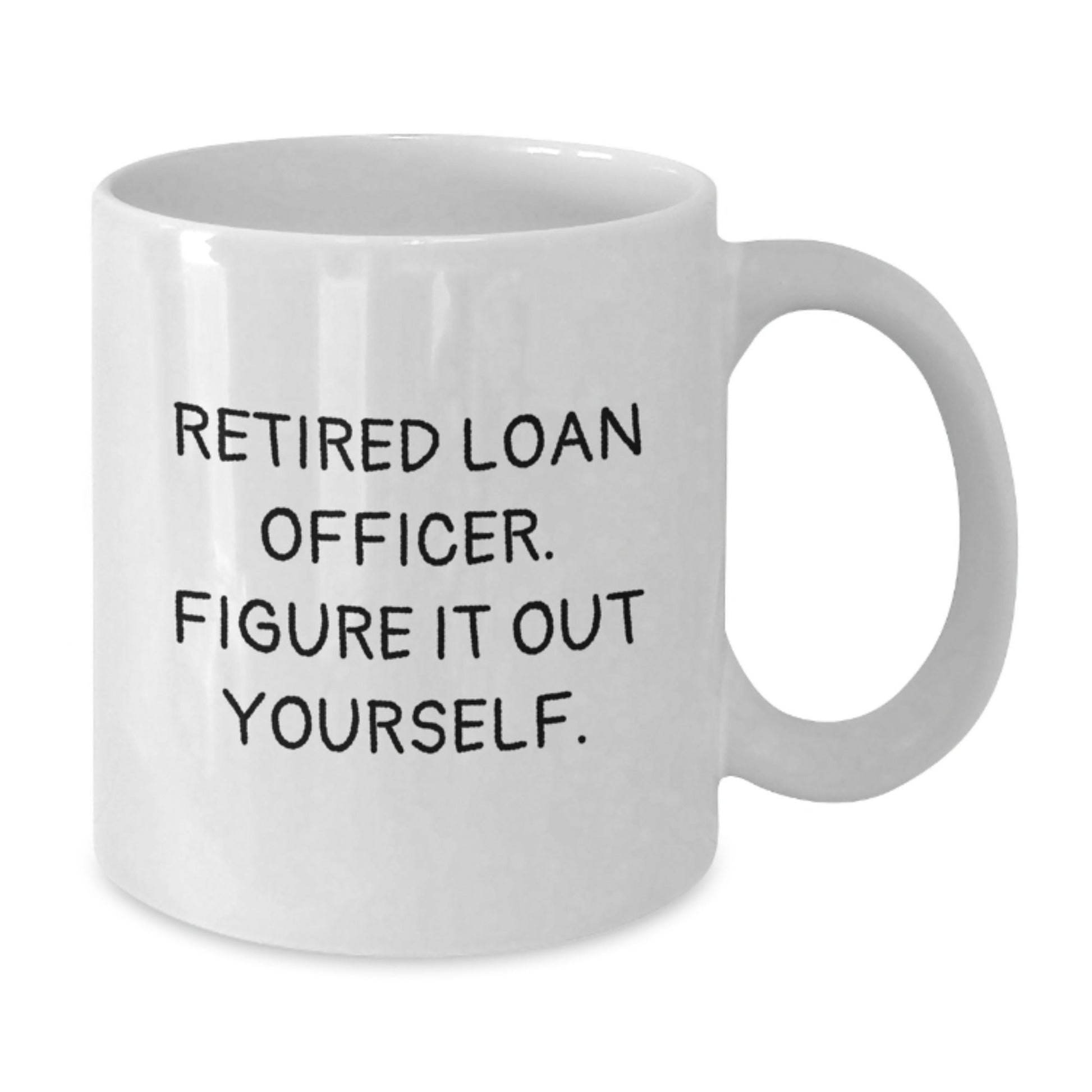 "bullet_points": ["Make a statement with this funny quote coffee mug, perfect for Loan Officers and coffee lovers alike", "High-quality ceramic construction ensures durability and longevity", "Microwave and dishwasher safe for easy use and cleaning", "Available in 11oz or 15oz capacity to fit your beverage needs", "'Retired Loan Officer. Figure It Out Yourself.' quote is a humorous take on the challenges of being a Loan Officer - perfect for a graduation gift or any occasion"],