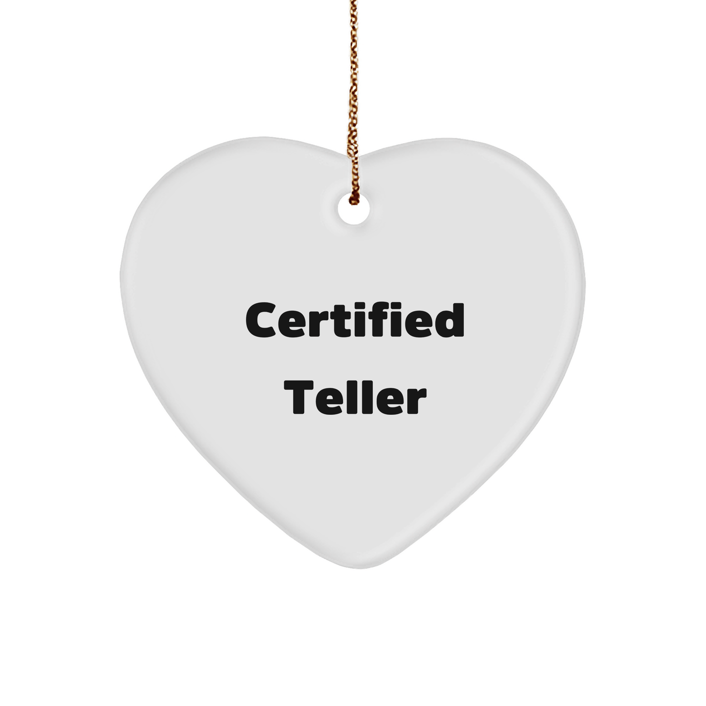 - Add a touch of humor to your holiday decor with this Funny Quote Teller Heart Ornament, featuring the quote 'Certified Teller' and a vibrant red and white design.