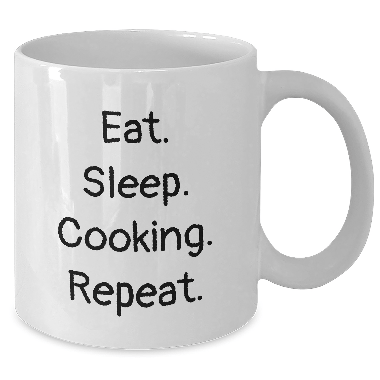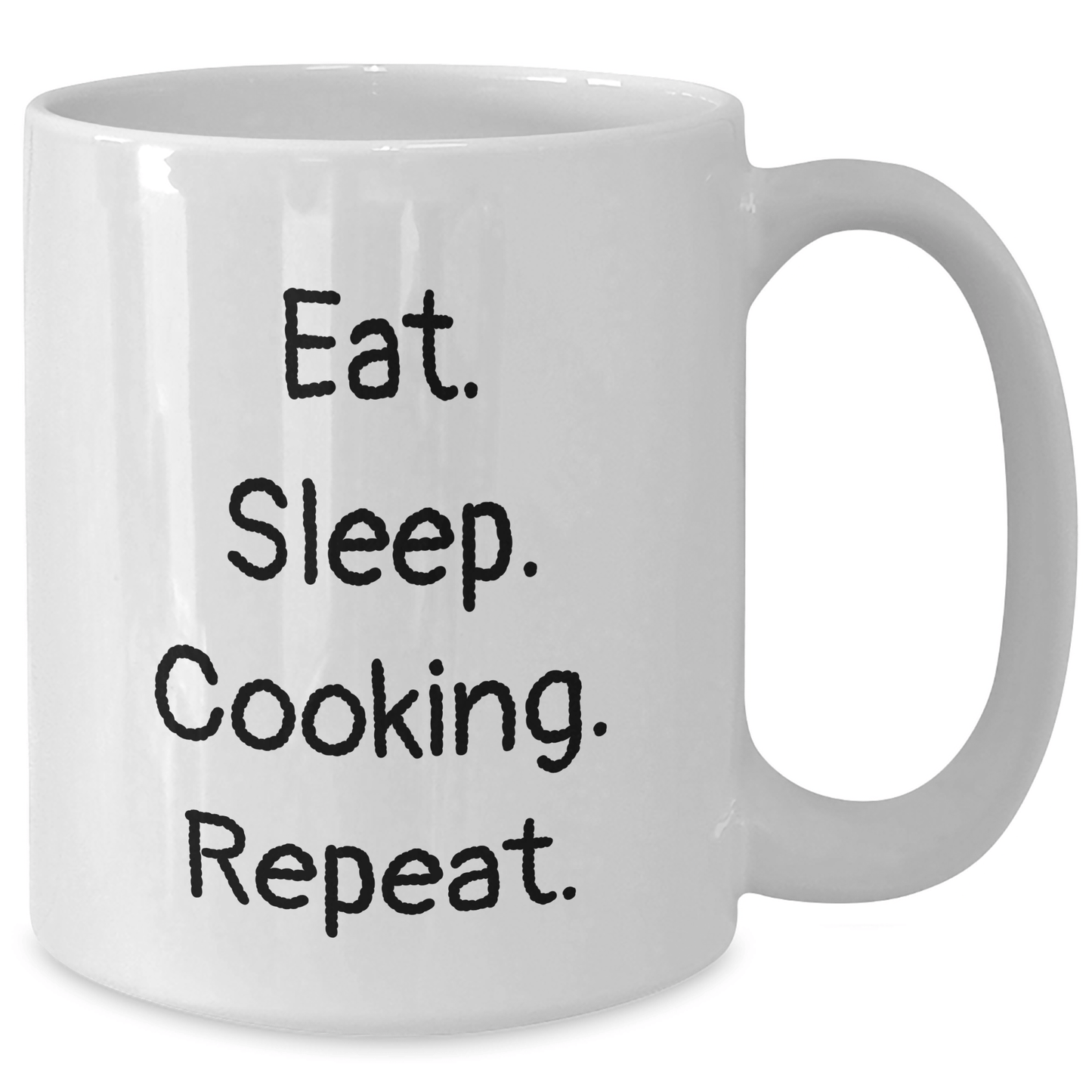 So don't wait any longer, get your 'Eat. Sleep. Cooking. Repeat.' white coffee mug today and show your love for cooking in a fun and unique way. Whether it's a gift for a friend or a treat for yourself, this mug is sure to bring a smile to your face every time you use it.