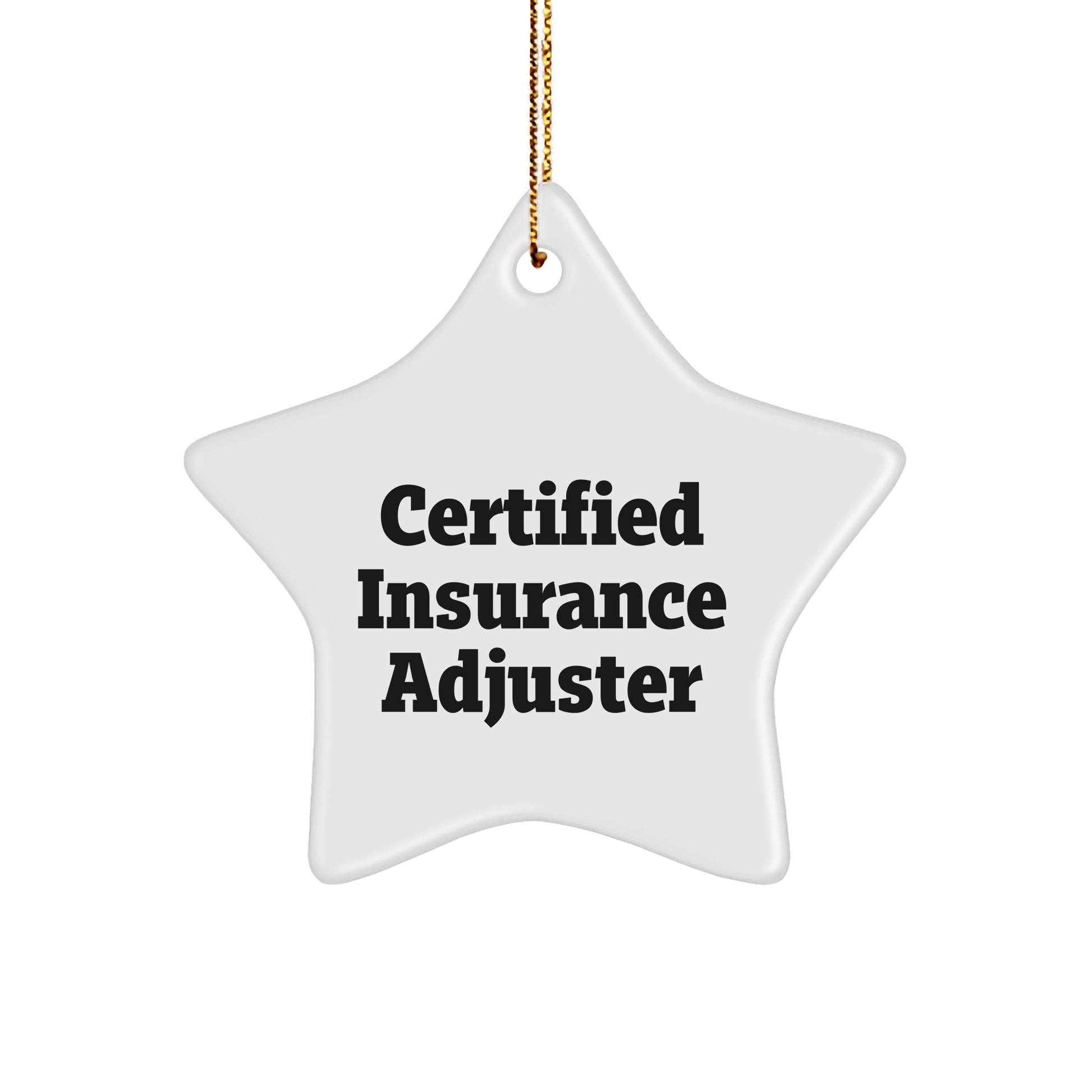 - This Certified Insurance Adjuster star ornament is the ideal gift for any occasion, whether it's Christmas or just a small token of appreciation. It's also a great way to show off your Insurance Adjuster pride and add a touch of humor to your holiday decor.