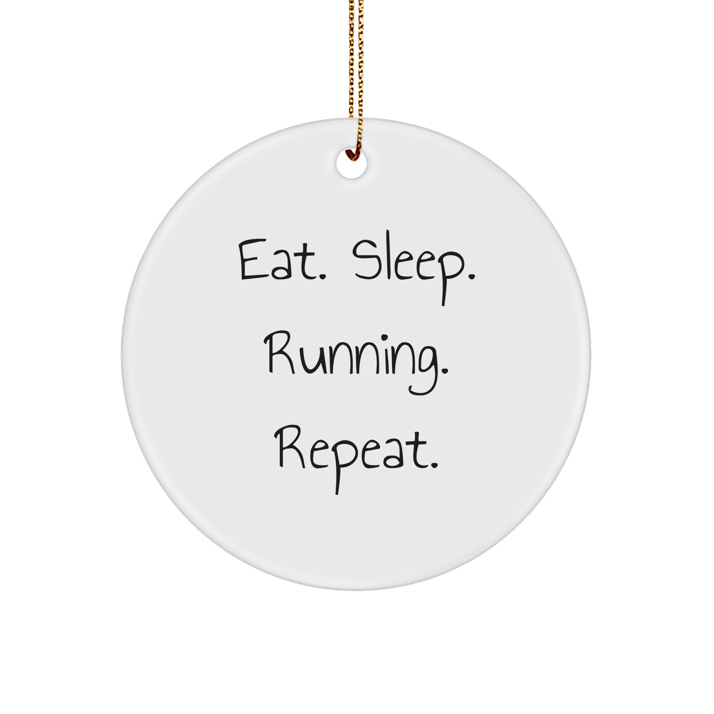 - A thoughtful gift for running friends, coworkers, or family members, encouraging them to keep on running with the quote 'Eat. Sleep. Running. Repeat.'