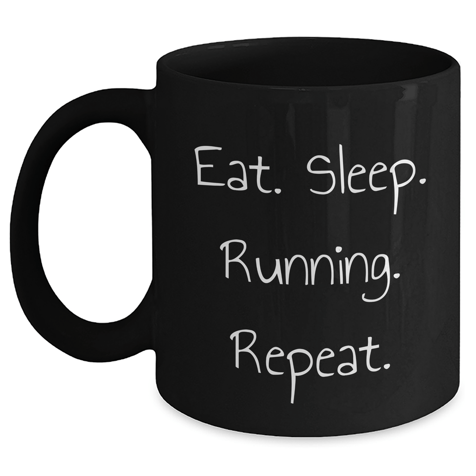 Whether you're sending this gift to a fellow Running enthusiast or a recent graduate who loves to hit the trails, this mug is sure to bring a smile to their face. The quote 'Eat. Sleep. Running. Repeat.' is a fun and motivational reminder to keep pushing forward, no matter what life throws your way. And with its sleek black design, it's a great addition to any Running-themed decor.
