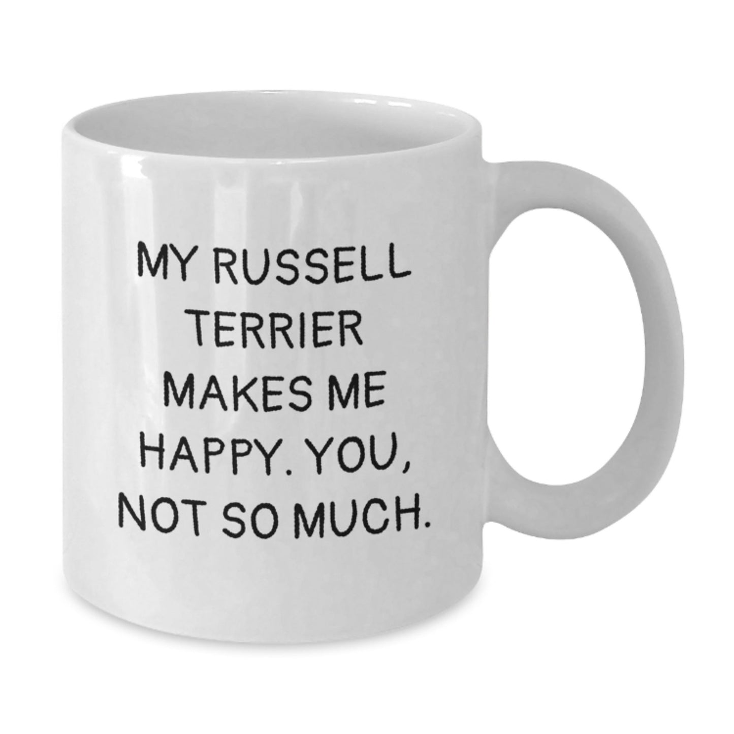 Are you a Russell Terrier Dog enthusiast? Do you know someone who loves these adorable dogs? This funny quote coffee mug is the ideal gift for them! 'My Russell Terrier Makes Me Happy. You, Not So Much.' is a hilarious and relatable quote that any Russell Terrier Dog lover will appreciate. The mug is made of high-quality ceramic, available in 11oz or 15oz capacity, and is safe for microwave and dishwasher use. Whether it's a birthday gift for a friend, family member, or coworker, this unique gift is sure to bring a smile to their face. So why settle for a boring gift when you can give a gift that's as unique as the person who receives it?