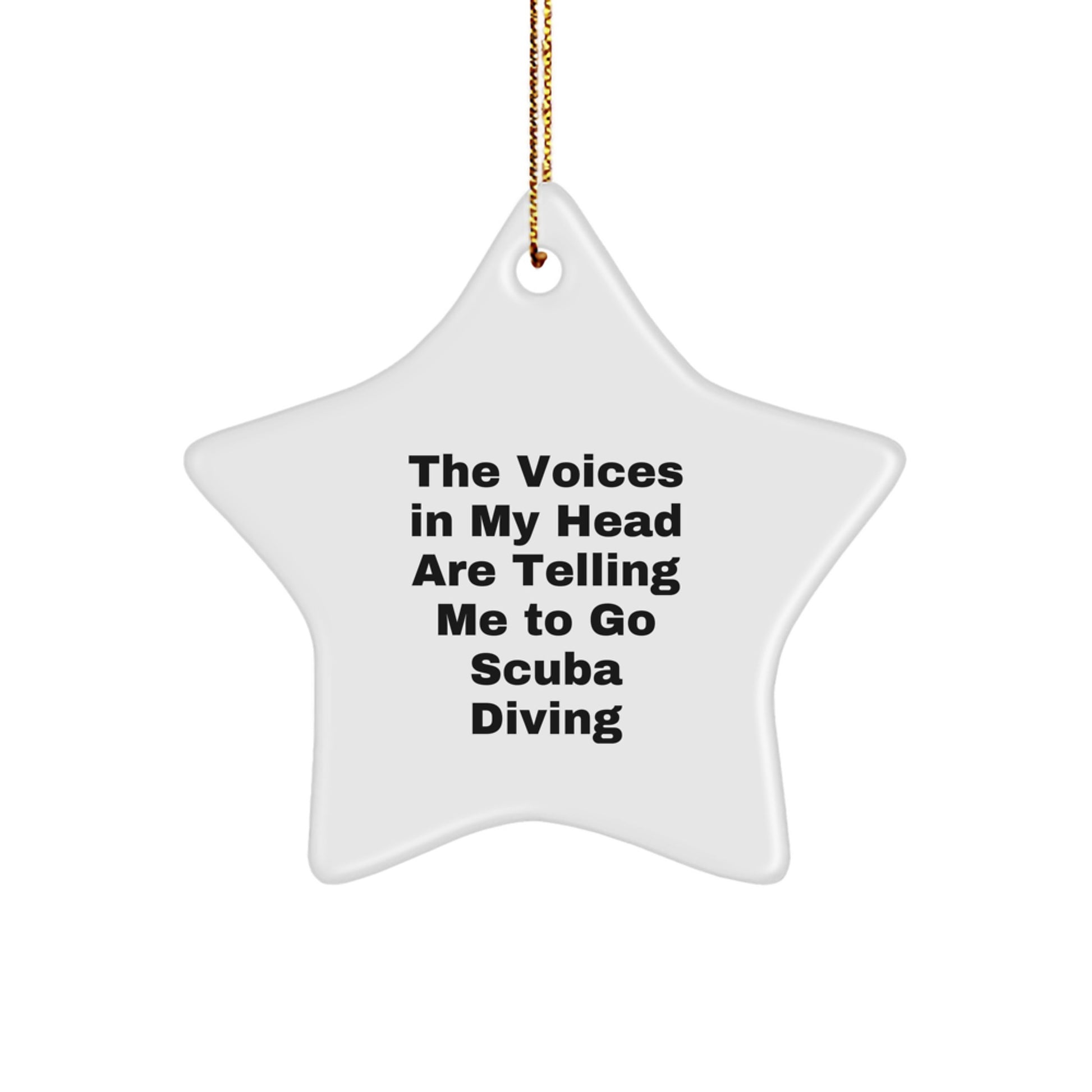 If you know someone who loves scuba diving, this unique gift is perfect for them. This star ornament is vibrantly printed with a funny quote that will make them smile. The quote says 'The Voices In My Head Are Telling Me To Go Scuba Diving' and is a great conversation starter. This ornament is crafted from sturdy MDF with a high-gloss plastic finish and is lightweight and resistant to breaking. It's a great choice for households with children or pets. The star shape is a classic symbol of the holiday season and this ornament is perfect for hanging on the Christmas tree or giving as a gift. Whether you're shopping for a friend, family member, or coworker, this scuba diving star ornament is a thoughtful and unique gift idea that will be cherished for years to come. So why wait? Get your scuba diving star ornament today and make someone's holiday season a little brighter!