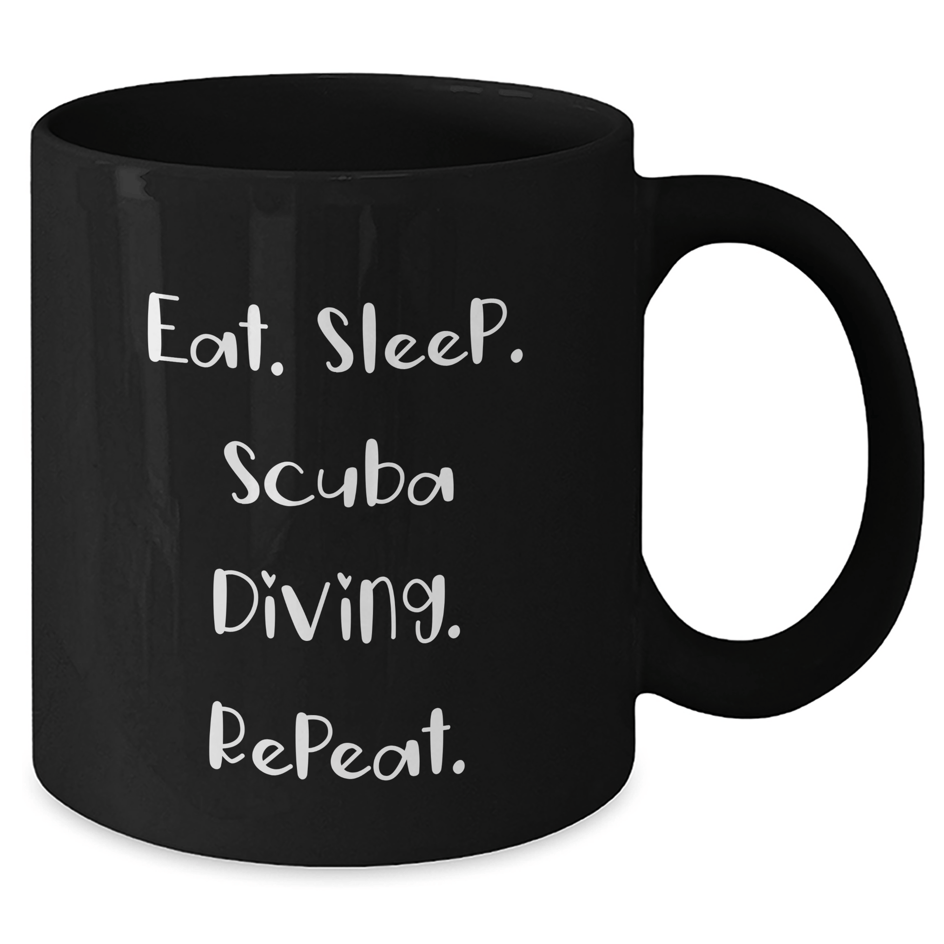 Are you a scuba diving enthusiast or looking for a unique gift for the scuba diving lover in your life? This funny black coffee mug is perfect for daily use, and its inspirational quote will encourage the wearer to 'Eat. Sleep. Scuba Diving. Repeat.'