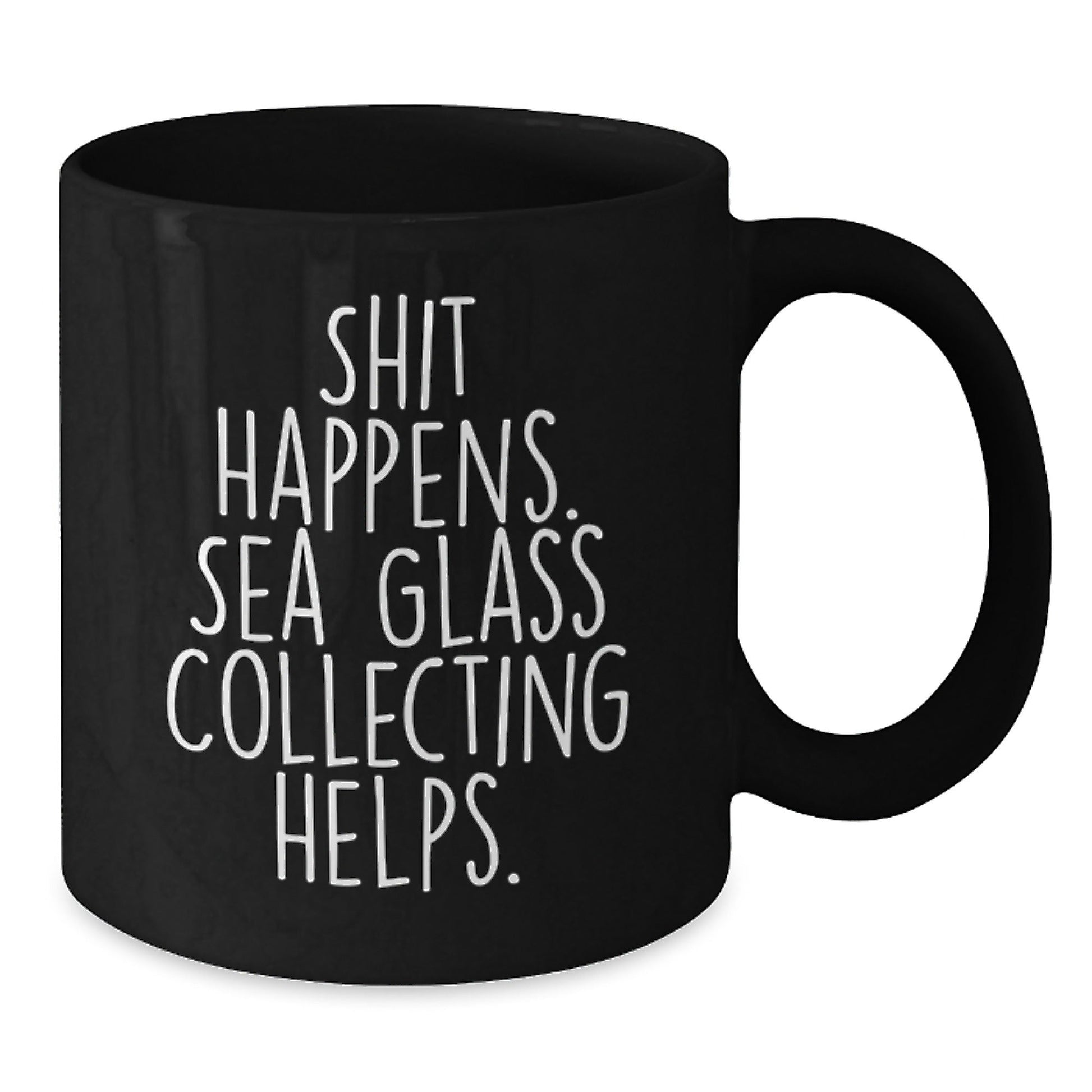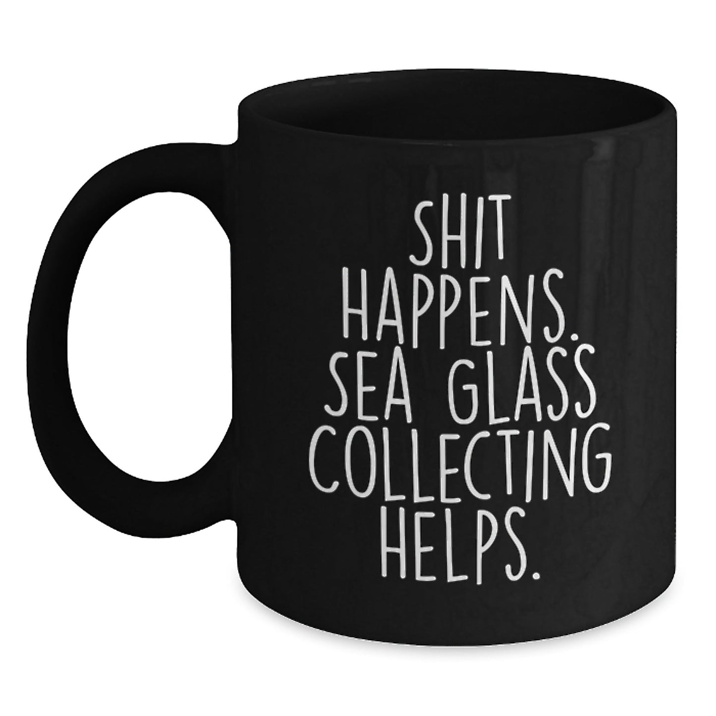 - Start your day with a refreshing cup of coffee and a reminder that 'Shit Happens. Sea Glass Collecting Helps.' with this thoughtful graduation gift for the sea glass collector in your life. Perfect for commemorating a milestone achievement, this 11oz or 15oz black ceramic mug is microwave and dishwasher safe, making it easy to clean and reuse.