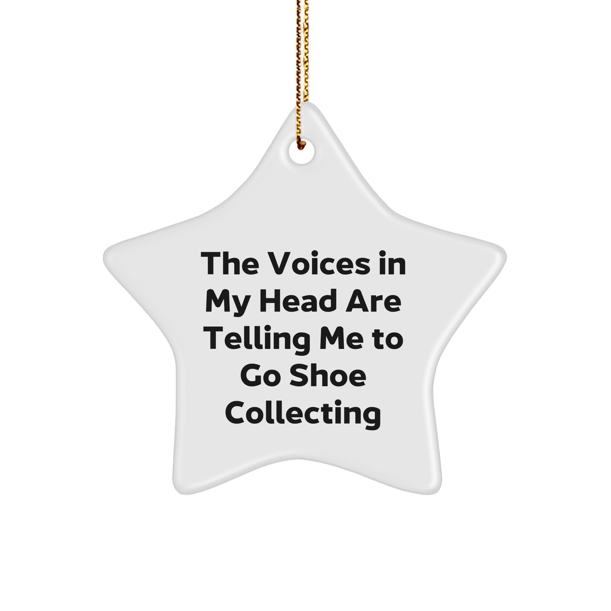 Are you a shoe collector or know someone who is? Look no further! This hilarious quote, 'The Voices In My Head Are Telling Me To Go Shoe Collecting', is a perfect addition to any shoe enthusiast's collection. Made from sturdy MDF with a high-gloss plastic finish, this Star Ornament is vibrantly printed from edge-to-edge via Sublimation, ensuring bright, vivid colors. Lightweight and resistant to breaking, it's a great choice for households with children or pets. Ships with a festive gold cord for easy hanging, perfect for stress-free decorating. Whether you're a shoe collector yourself or know someone who is, this unique gift is sure to bring a smile to their face. So why wait? Get your 'The Voices In My Head Are Telling Me To Go Shoe Collecting' Star Ornament today and show off your shoe love!