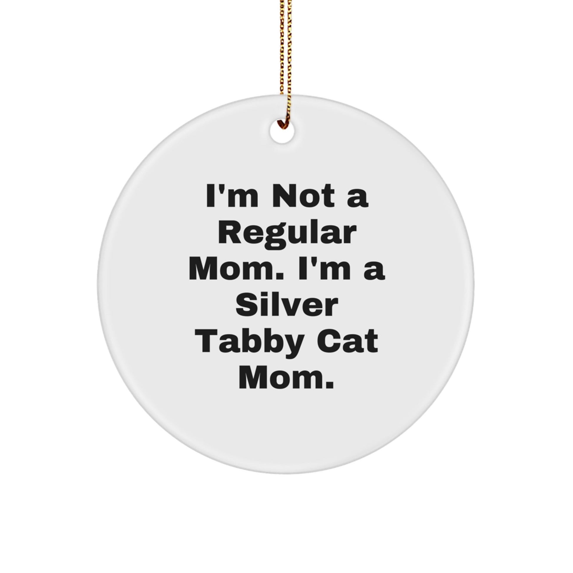 Are you a proud Silver Tabby Cat mom? Do you love showing off your funny side? This 'I'm Not A Regular Mom. I'm A Silver Tabby Cat Mom.' Circle Ornament is a great way to do just that. With its vibrant colors and high-quality finish, it's the purrfect gift for any Silver Tabby Cat enthusiast. Whether you're giving it to a friend or family member, this ornament is sure to bring a smile to their face.
