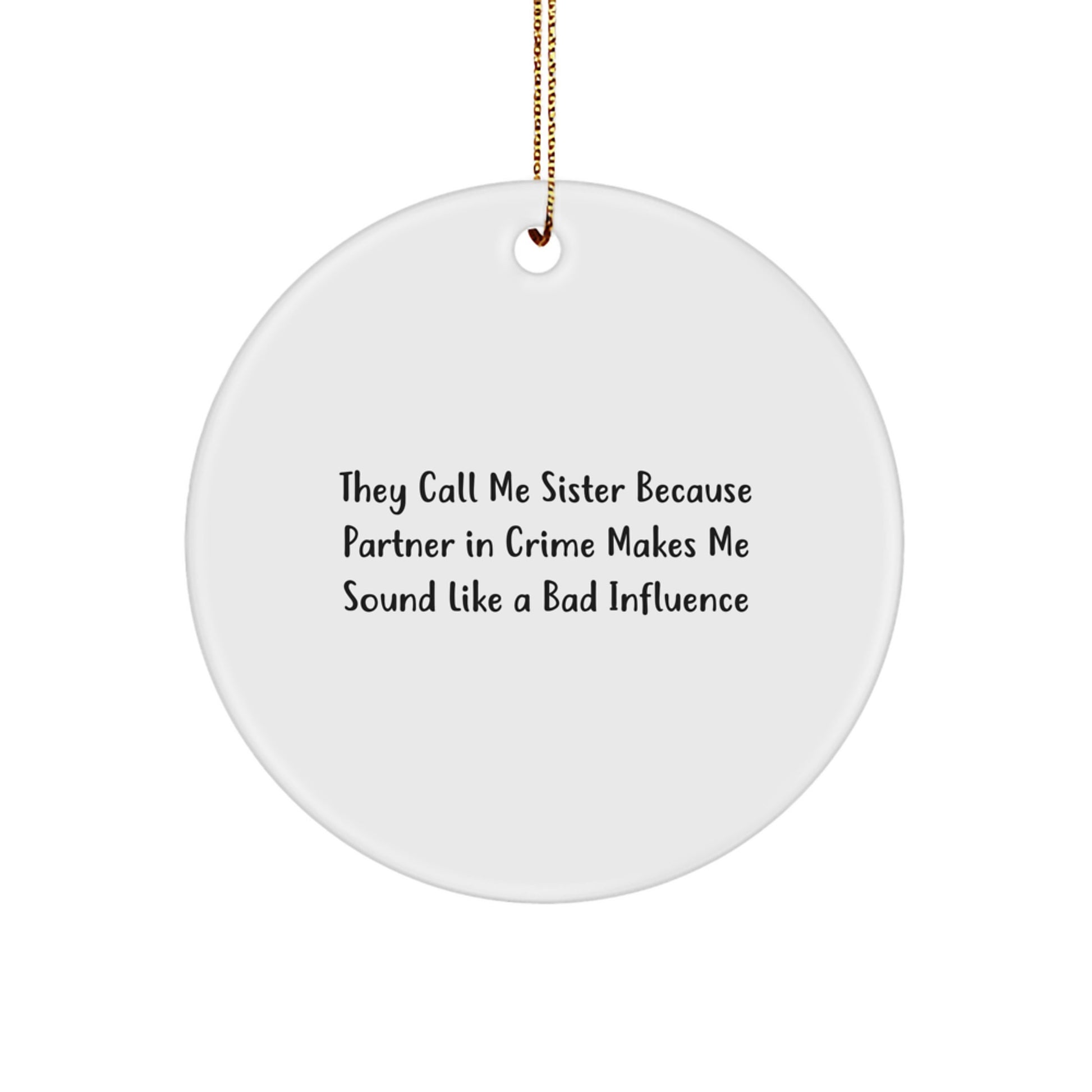 - Add a touch of humor to your sister's holiday decor with this funny Circle Ornament, featuring the quote 'They Call Me Sister Because Partner In Crime Makes Me Sound Like A Bad Influence'.