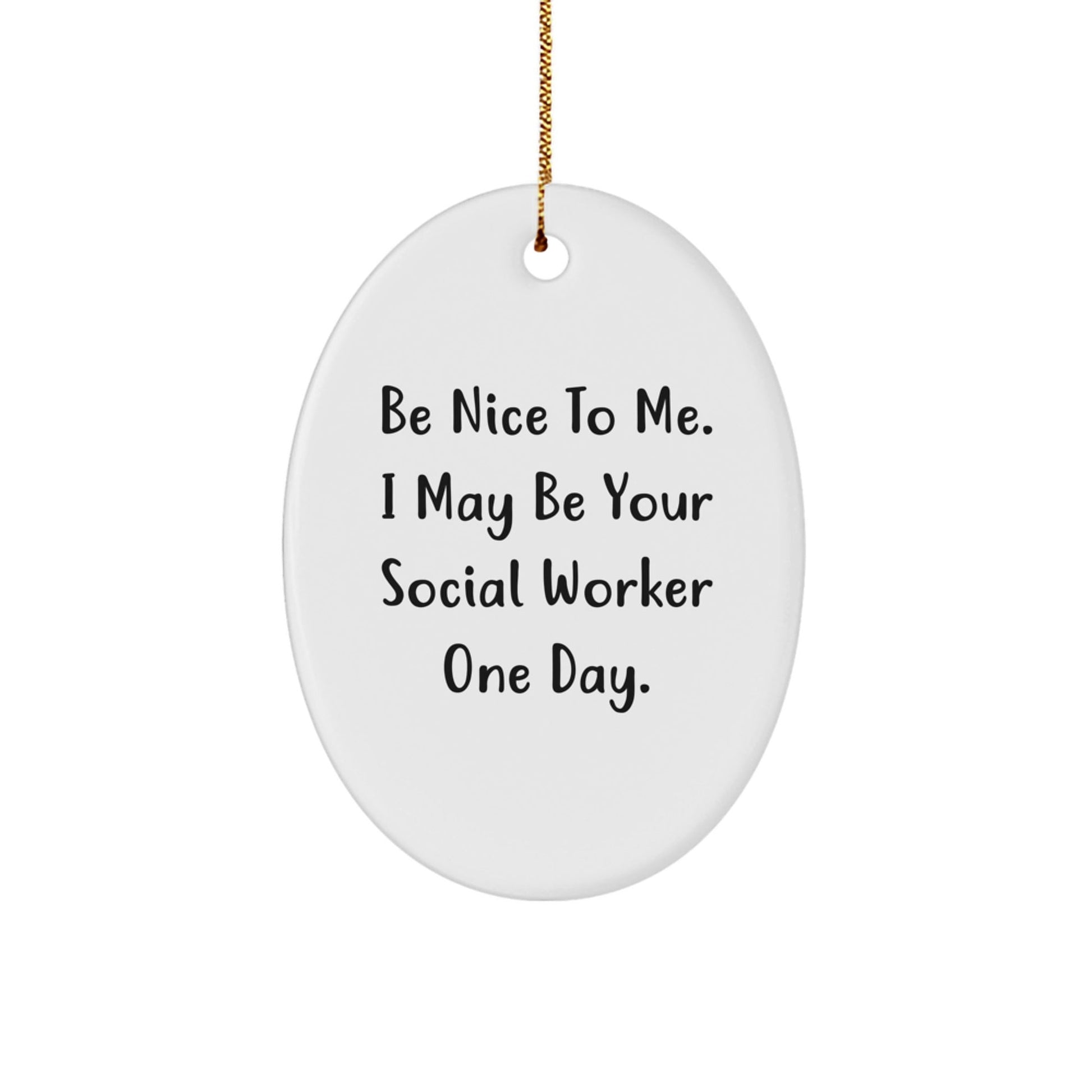 - This funny oval ornament makes a thoughtful gift for social workers, friends, and family. The quote 'Be Nice To Me. I May Be Your Social Worker One Day.' adds a touch of humor and personality to any room.