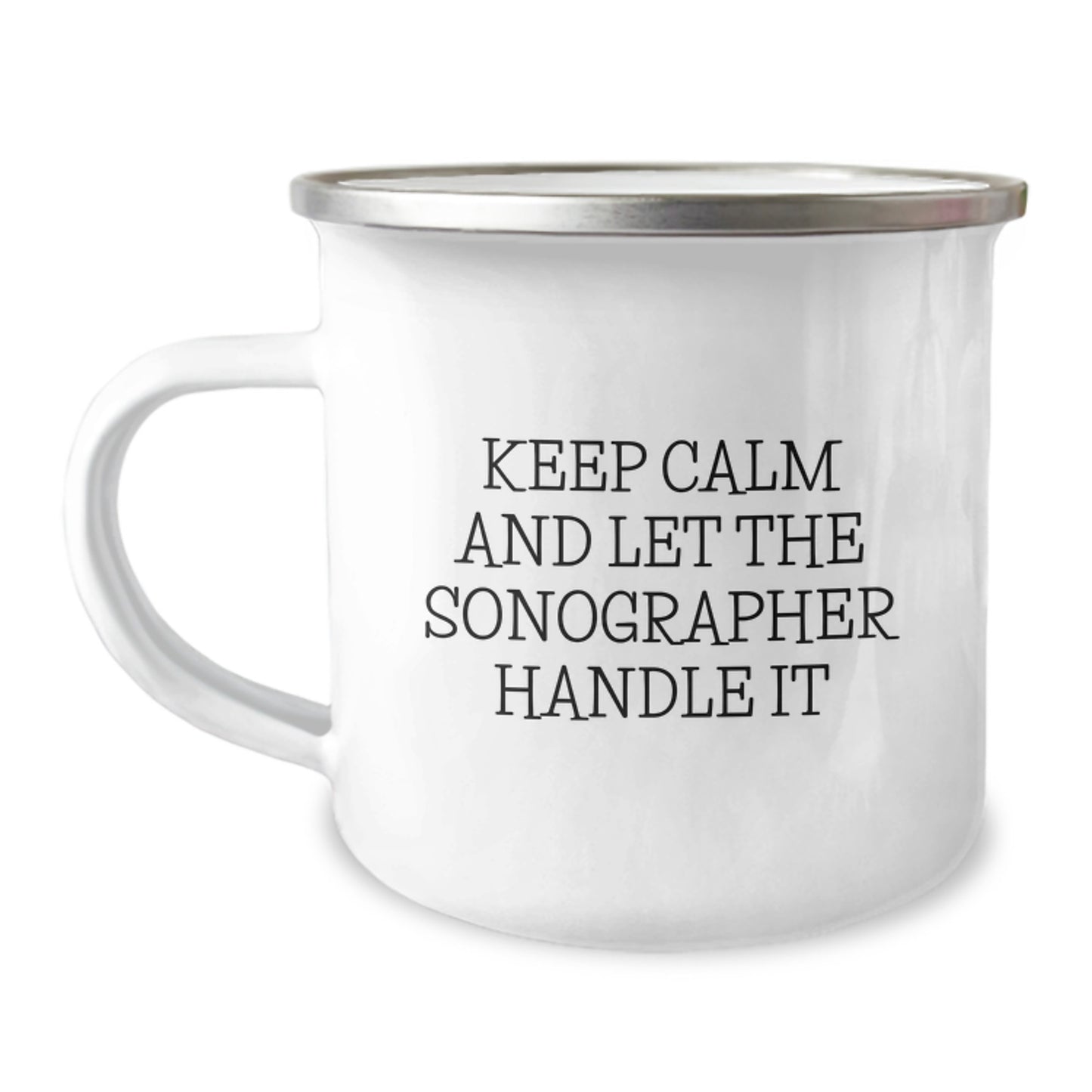 • This funny 'Keep Calm And Let The Sonographer Handle It' camping mug is the ideal gift for any sonographer who loves to unwind with a hot cup of coffee or tea. Made of high-quality stainless steel with a sturdy enamel finish, it's the perfect way to show your appreciation for their hard work and dedication to their craft.