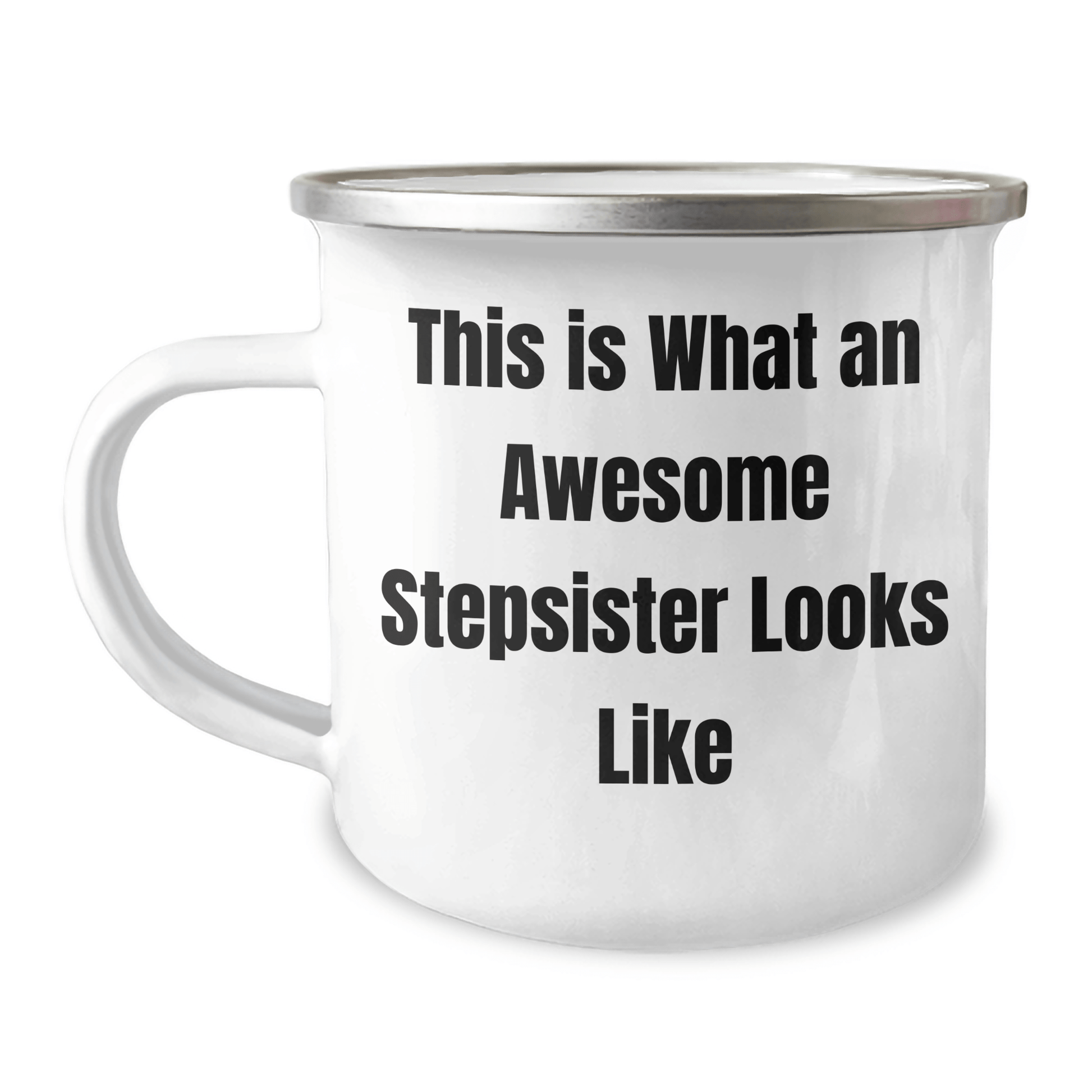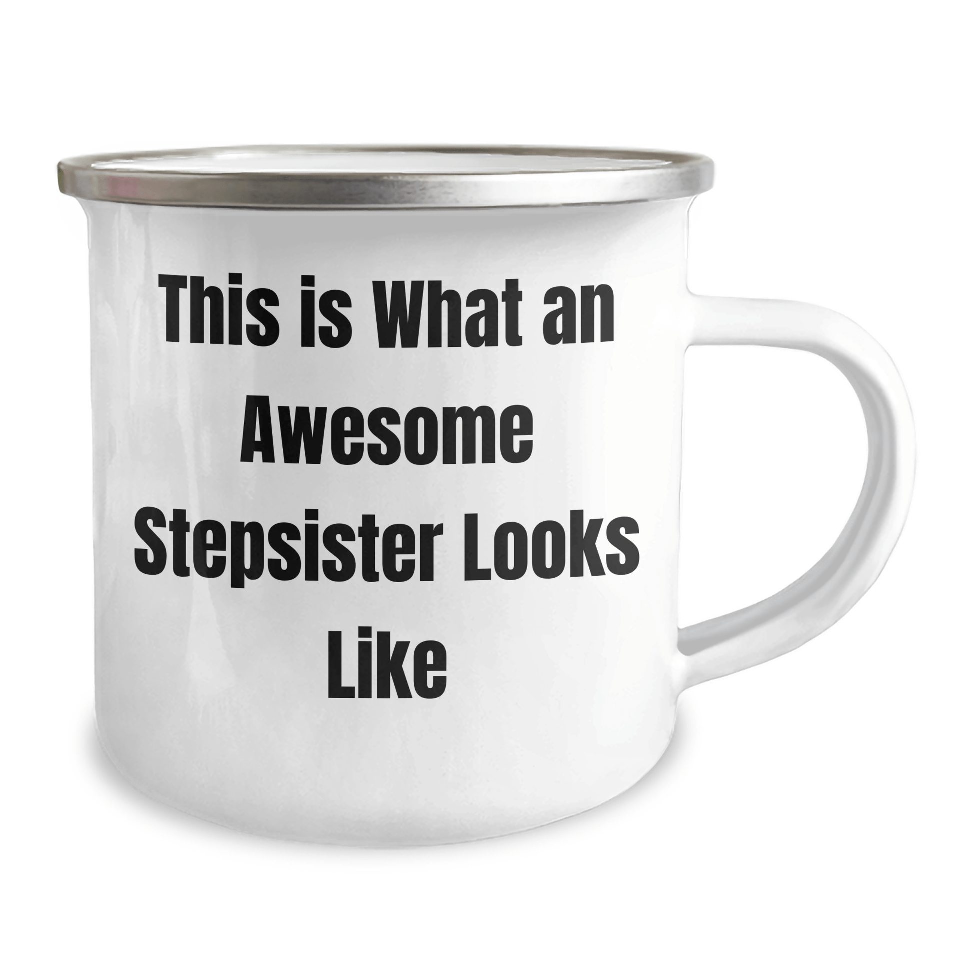 - Make a statement with this 'This Is What An Awesome Stepsister Looks Like' Camping Mug, perfect for outdoor enthusiasts and stepsisters alike. The stainless steel with enamel finish ensures durability and resistance to scratches and corrosion. With a 12 oz capacity, it's the ideal size for a hot cup of coffee or tea on a camping trip or at a graduation celebration.