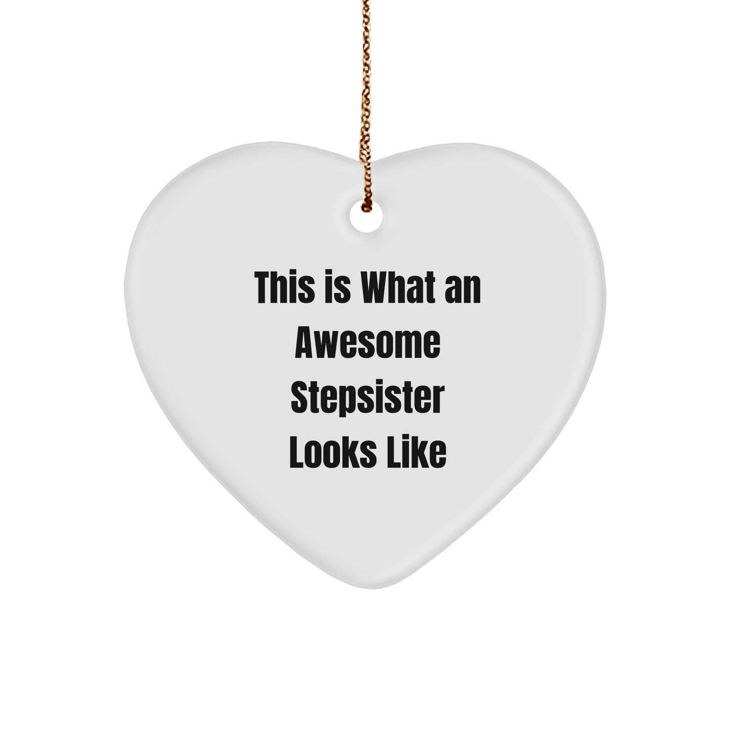 Are you looking for a unique and funny gift for your stepsister this Christmas? Look no further! Our Heart Ornament with the quote 'This Is What An Awesome Stepsister Looks Like' is the perfect present for any stepsister who brings joy and laughter to your life. Made from sturdy MDF with a high-gloss plastic finish, this ornament is lightweight and resistant to breaking, making it a great choice for households with children or pets. The vibrant colors and edge-to-edge sublimation printing ensure that the design remains bright and vivid. The festive gold cord for easy hanging makes it a stress-free decorating experience. Whether you're a woman looking for a gift from women to stepsister or just want to show your appreciation for your stepsister, this heart ornament is the perfect way to do so. So, go ahead and get this awesome stepsister gift for your stepsister this Christmas!