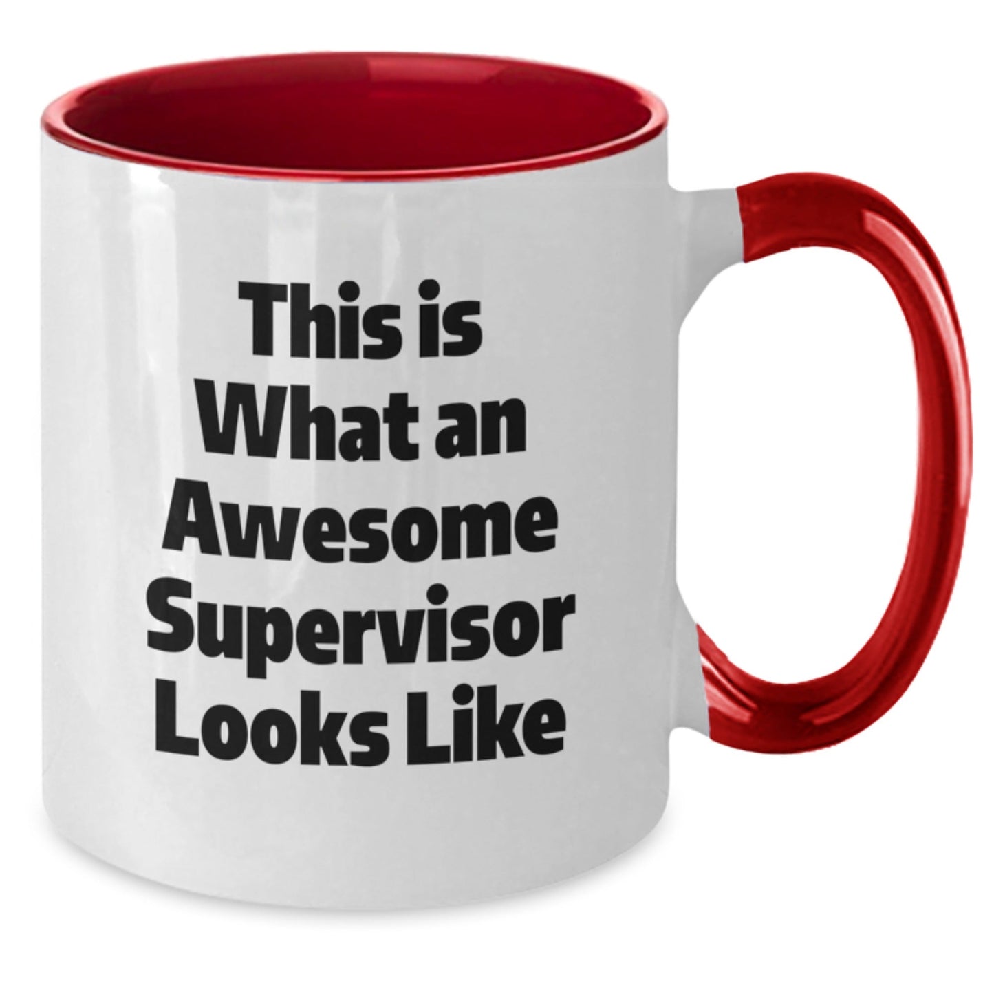 - Make a statement with this Two Tone Coffee Mug, perfect for the 'This Is What An Awesome Supervisor Looks Like' leader in your life. With four unique color combinations, you're sure to find a Supervisor-approved design that matches their personality. From Black and White to Pink and White, these mugs are sure to impress.