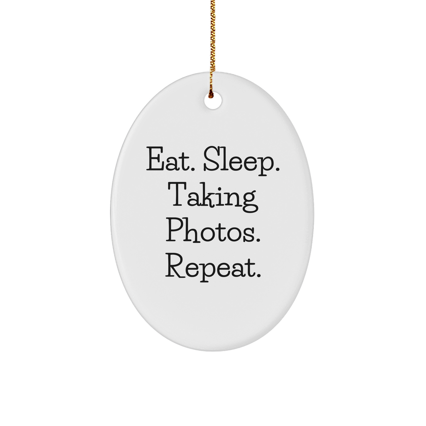 As the quote says, 'Eat. Sleep. Taking Photos. Repeat.' - it's a photographer's motto, and this ornament is a fun way to live it. So, go ahead and treat your friends to this unique and thoughtful gift. They'll surely appreciate it.