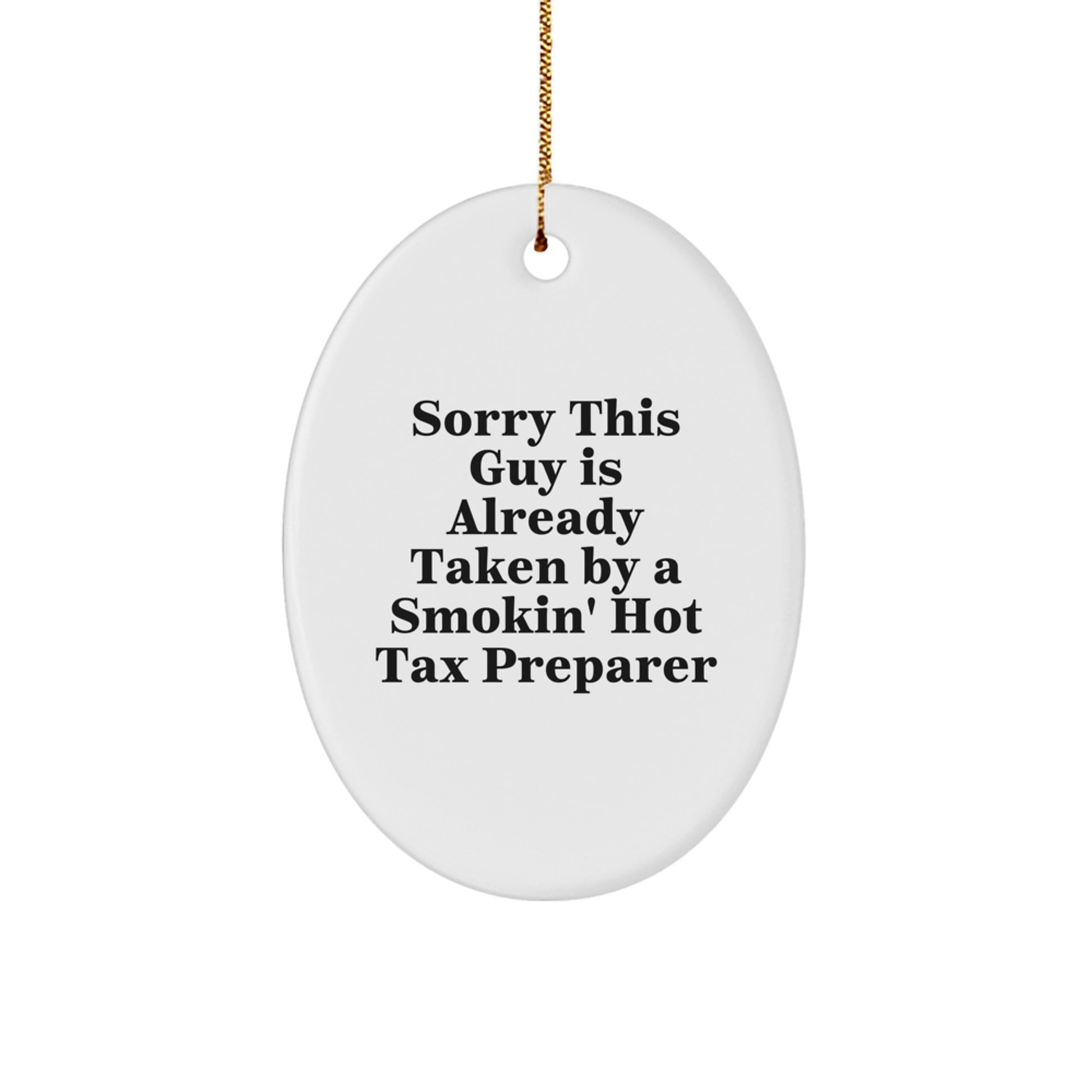 Get ready to crack up with this hilarious Tax Preparer Oval Ornament! Sorry This Guy Is Already Taken By A Smokin' Hot Tax Preparer is the perfect pun for any Tax Preparer enthusiast or those who appreciate a good laugh. This festive and fun ornament is crafted from sturdy MDF with a high-gloss plastic finish and vibrant Sublimation printing. Perfect for hanging on your Christmas tree or as a gift for your favorite Tax Preparer. Send a smile to your friends and family this holiday season with this unique and humorous Tax Preparer gift.