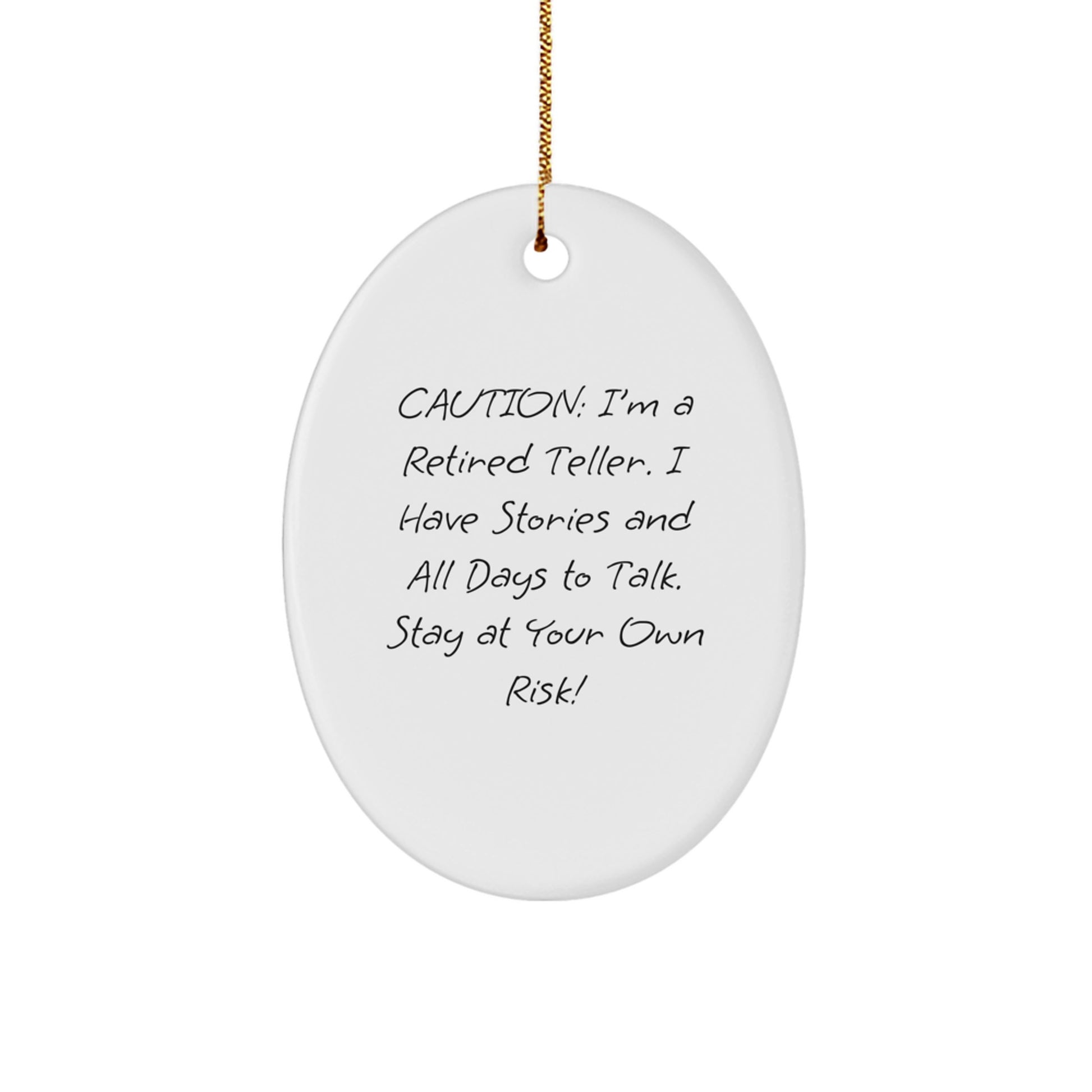 Are you a Teller enthusiast looking for a unique gift for a friend, family member, or coworker? Look no further! This oval ornament is carefully crafted with a high-gloss plastic finish and vibrant sublimation printing. It's the perfect way to show your appreciation for someone who's been a part of your life. And with the quote 'Caution: I'm A Retired Teller. I Have Stories And All Days To Talk. Stay At Your Own Risk!' it's sure to bring a smile to their face. Whether you're shopping for a Christmas gift or just looking for a fun way to decorate your home, this ornament is a great choice. So go ahead, take a chance and get this hilarious Teller gift!