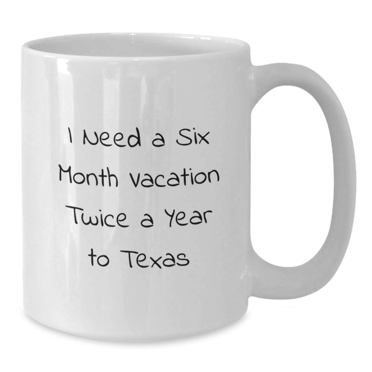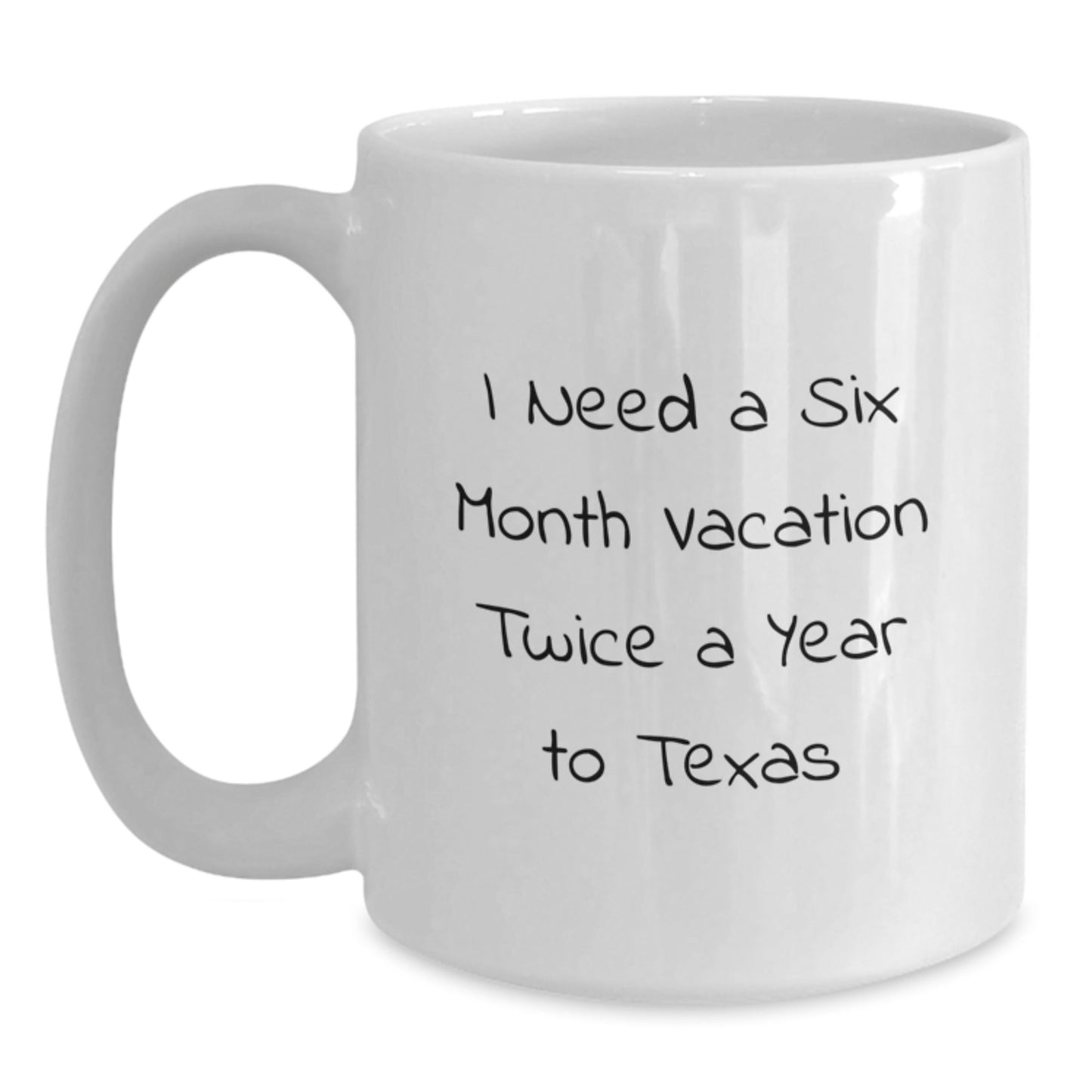 The quote 'I need a six month vacation twice a year to Texas' is a humorous take on the idea that a vacation to Texas is always needed. This mug is a great way to showcase your love for the state or to give as a gift to someone who shares your passion.