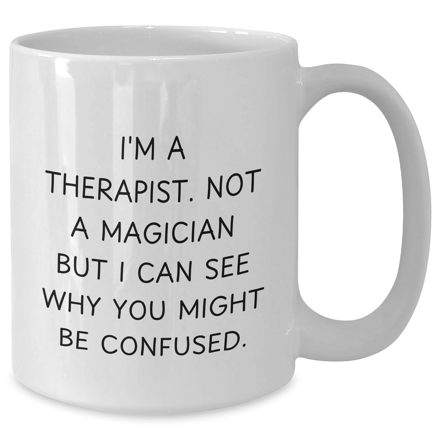 - As a therapist, you deserve a 'I'm A Therapist. Not A Magician But I Can See Why You Might Be Confused.' White Coffee Mug that reflects your profession and provides a comfortable way to enjoy your morning coffee or tea. With its sturdy ceramic construction, this mug is perfect for daily use and can withstand microwave and dishwasher cycles, making it easy to clean and maintain. Choose from 11oz or 15oz capacities to suit your needs.