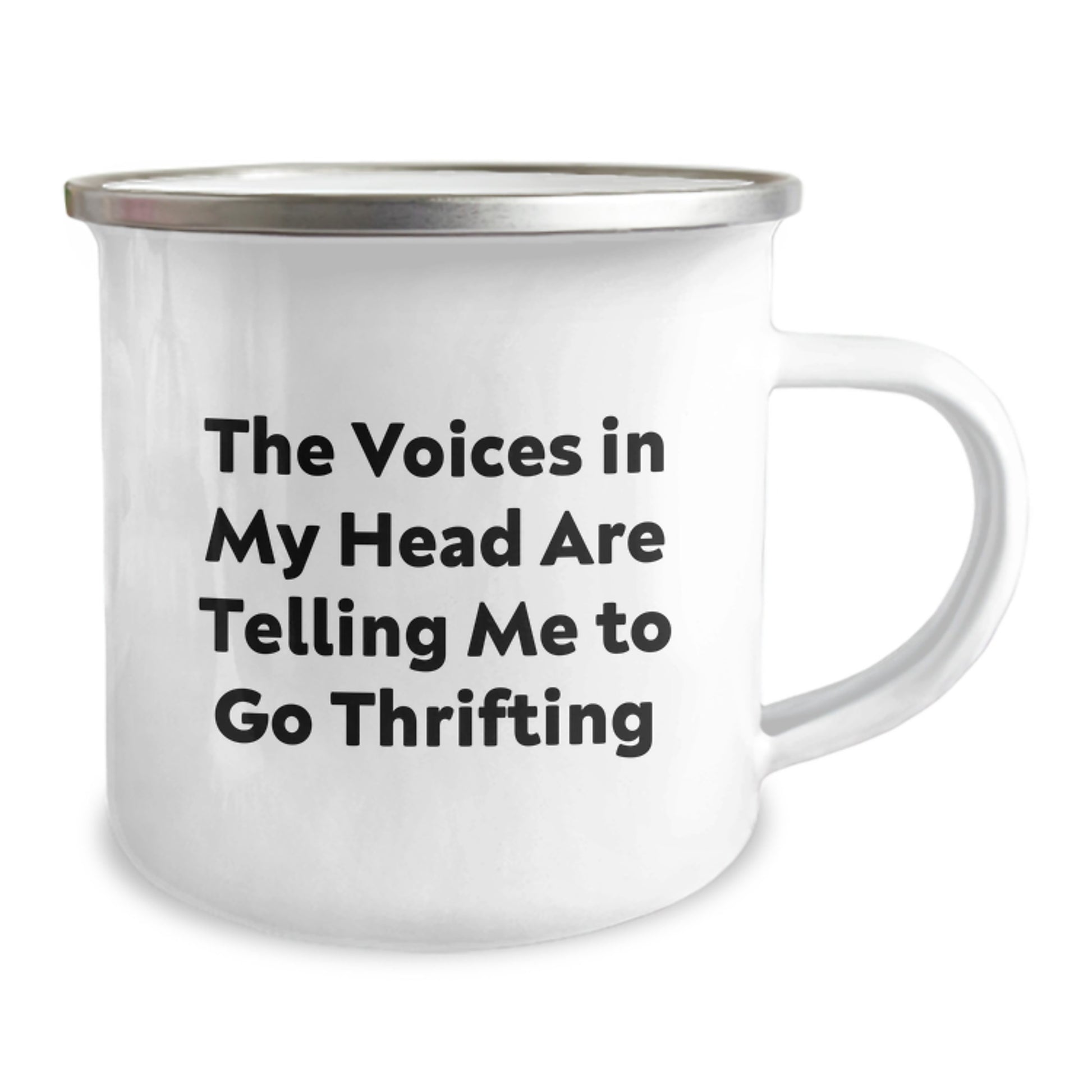 Funny Thrifting Gifts for Friends, Unique Camping Mug with Quirky Quote 'The Voices In My Head Are Telling Me To Go Thrifting', Birthday Unique Gifts from Men to Women