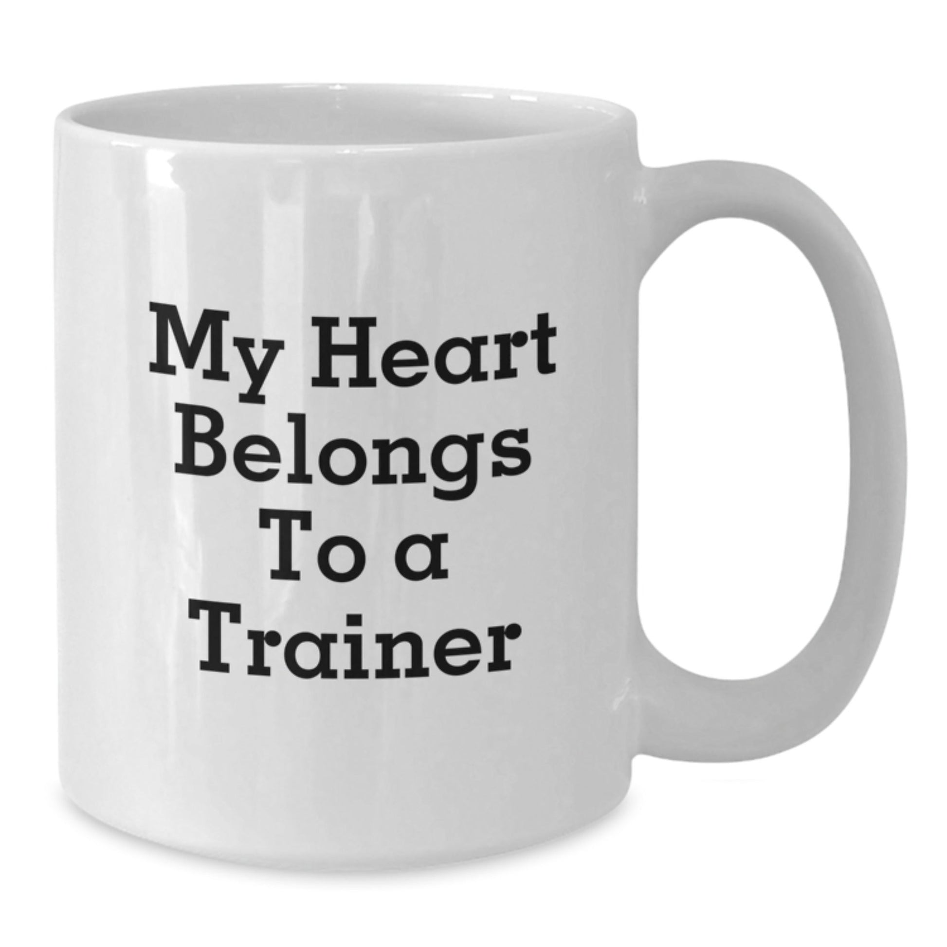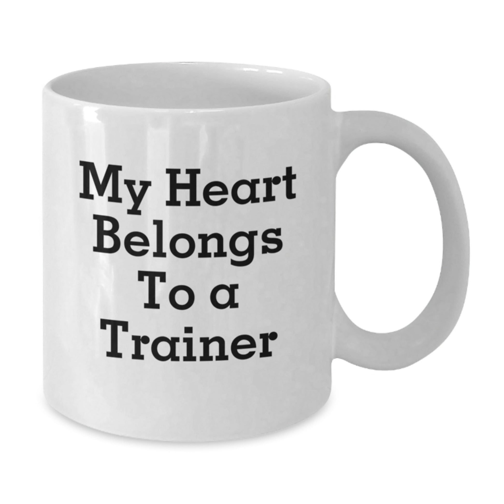 - This white coffee mug is a unique and funny way to show your trainer how much you care. The quote 'My Heart Belongs To A Trainer' is a perfect way to express your love and admiration for your trainer.
