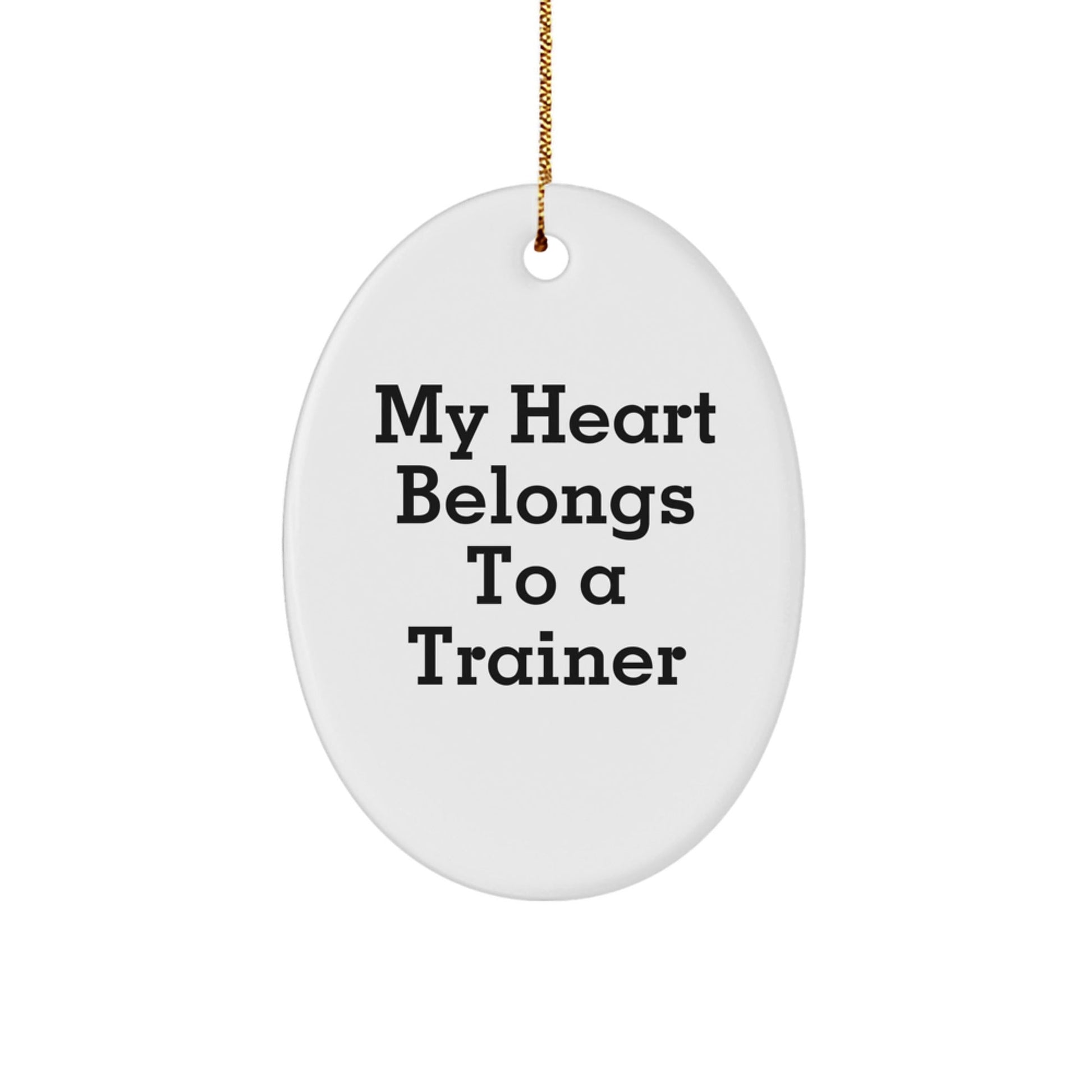 Are you a Trainer enthusiast looking for a unique gift for your favorite Trainer? Or perhaps you're searching for a thoughtful present for your loved one who's passionate about training? Look no further! This 'My Heart Belongs To A Trainer' Oval Ornament is the perfect way to show your appreciation and support.