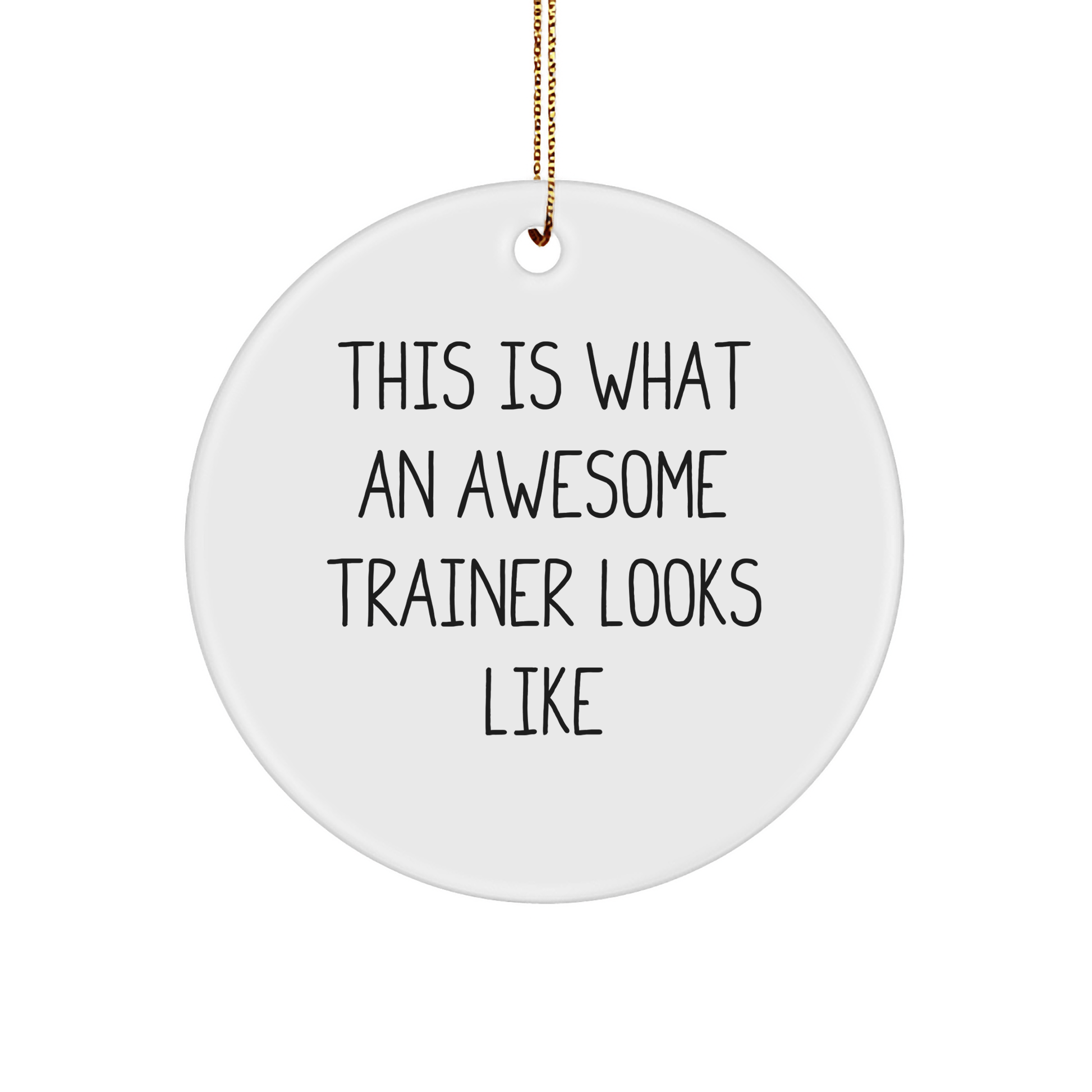 - Make a statement with this 'This Is What An Awesome Trainer Looks Like' circle ornament, crafted from sturdy MDF with a high-gloss plastic finish, ensuring long-lasting designs, vibrant colors, and a lightweight, break-resistant construction, perfect for households with children or pets.