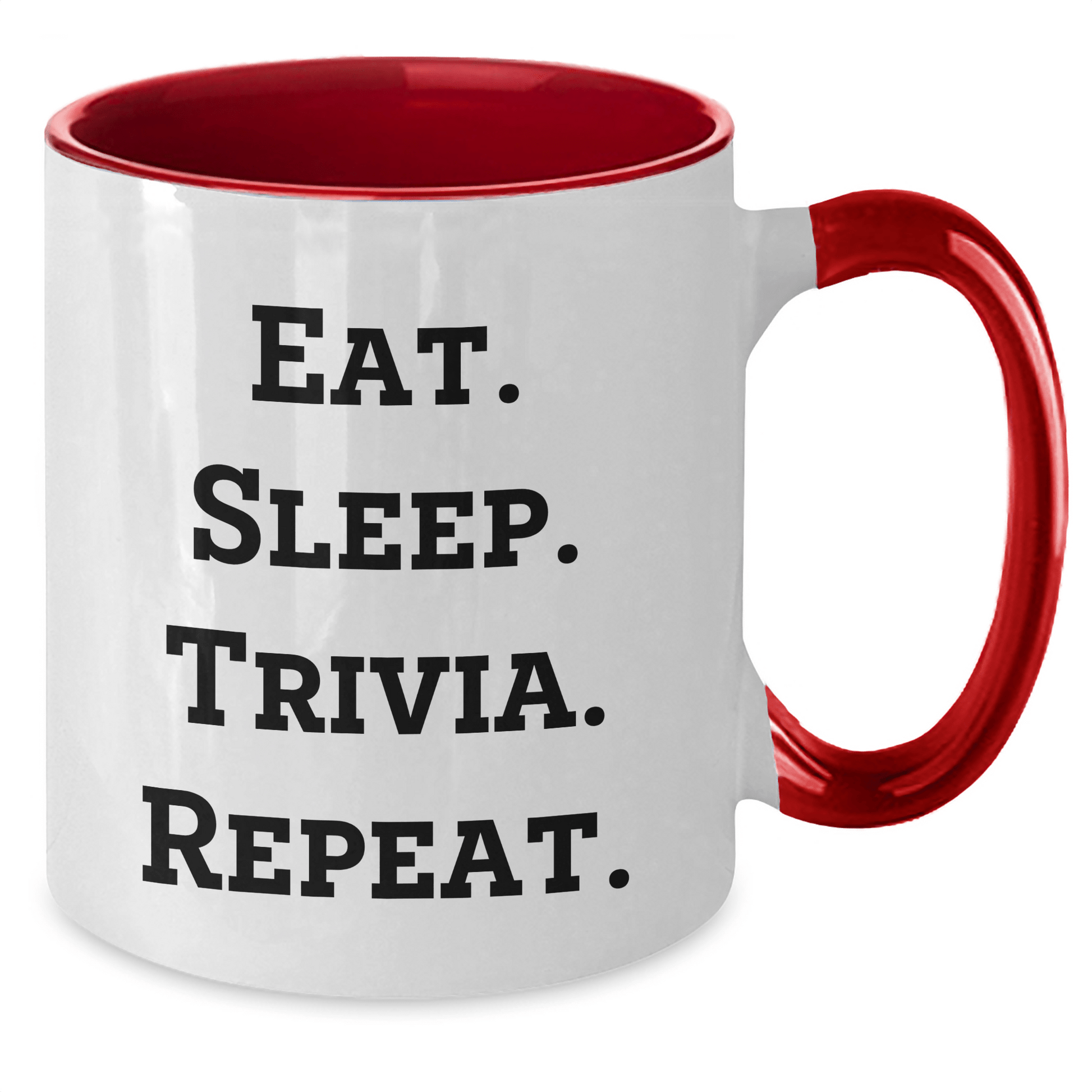 Whether you're a trivia buff or just a fan of fun and quirky gifts, this Two Tone Coffee Mug is sure to bring a smile to your face. It's the ideal gift for friends, coworkers, or family members who love to eat, sleep, and trivia repeat.