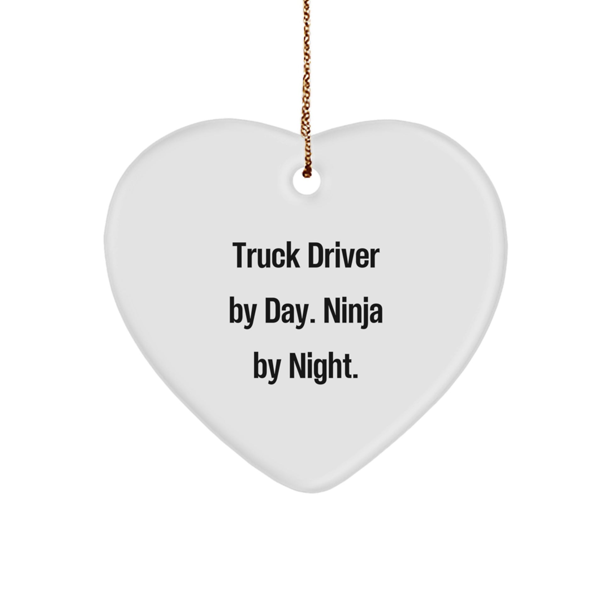 - This Funny Truck Driver Heart Ornament is the ideal gift for any truck driver enthusiast. The quote 'Truck Driver By Day. Ninja By Night.' is a hilarious and motivational phrase that will make any truck driver smile. Whether you're shopping for a friend, family member, or coworker, this ornament is a great choice.