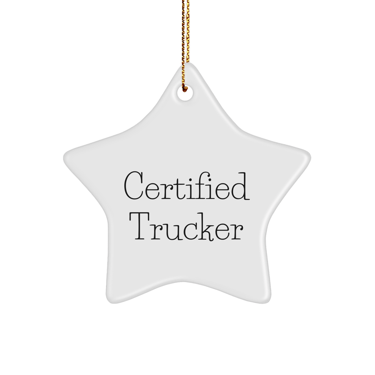 - Add a touch of humor to any room with this funny 'Certified Trucker' star ornament, perfect for truckers, trucking enthusiasts, and anyone who loves the open road.