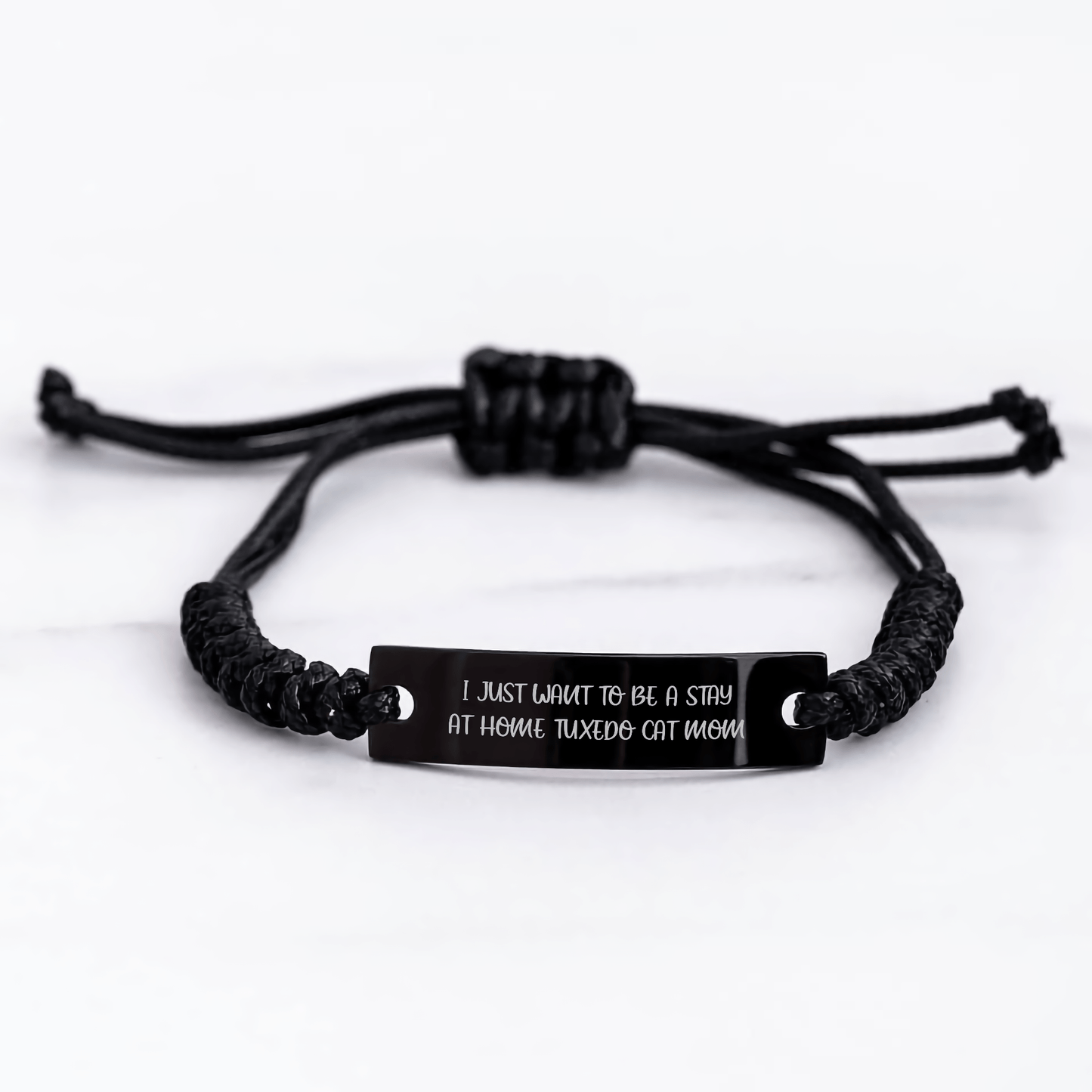 - The 'I Just Want To Be A Stay At Home Tuxedo Cat Mom' quote is beautifully engraved on this black stainless steel with braided rope rope bracelet, making it a thoughtful gift for any Tuxedo Cat lover on Father's Day. The adjustable design allows it to fit any wrist size, from 3.34 to 9.84 inches, ensuring a comfortable fit for any cat mom or dad.