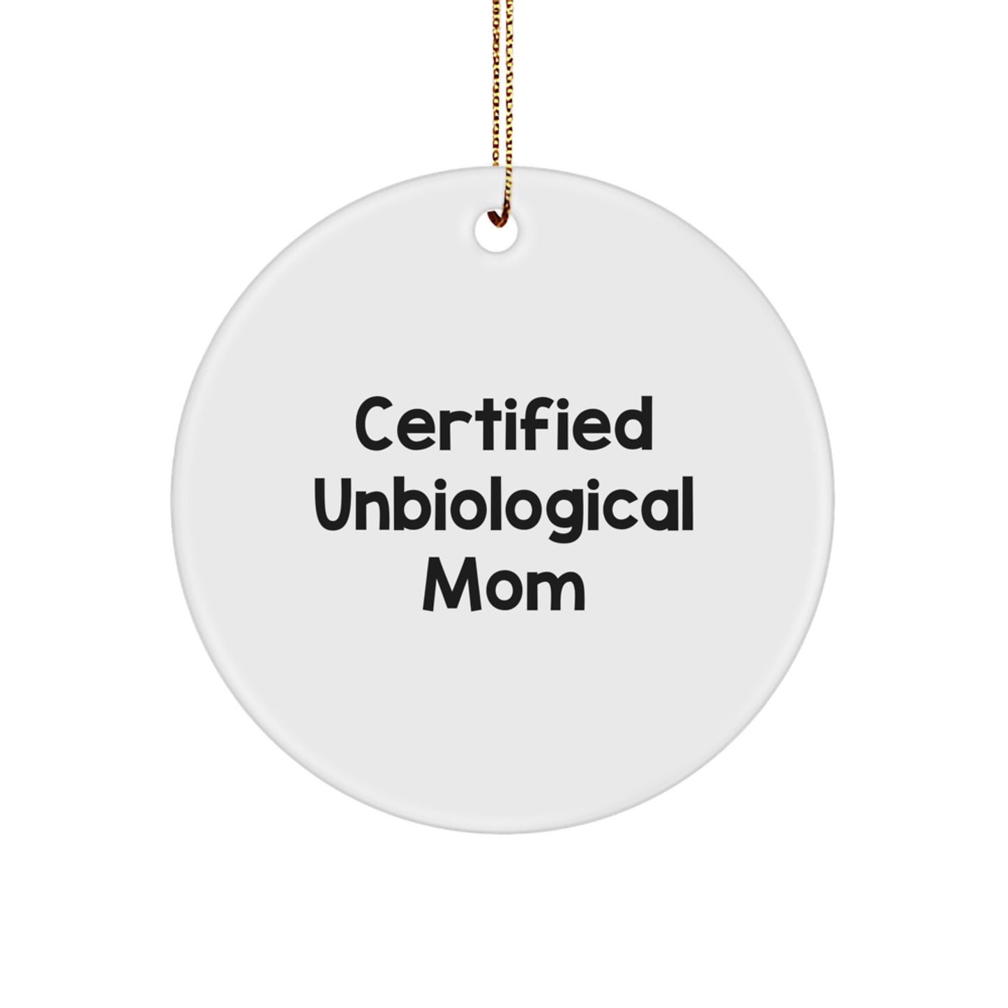 - The Certified Unbiological Mom quote is printed on a high-quality Circle Ornament that's perfect for decorating your home during the Christmas season. The ornament is made from sturdy MDF material and has a high-gloss plastic finish, ensuring that it will last for years to come.